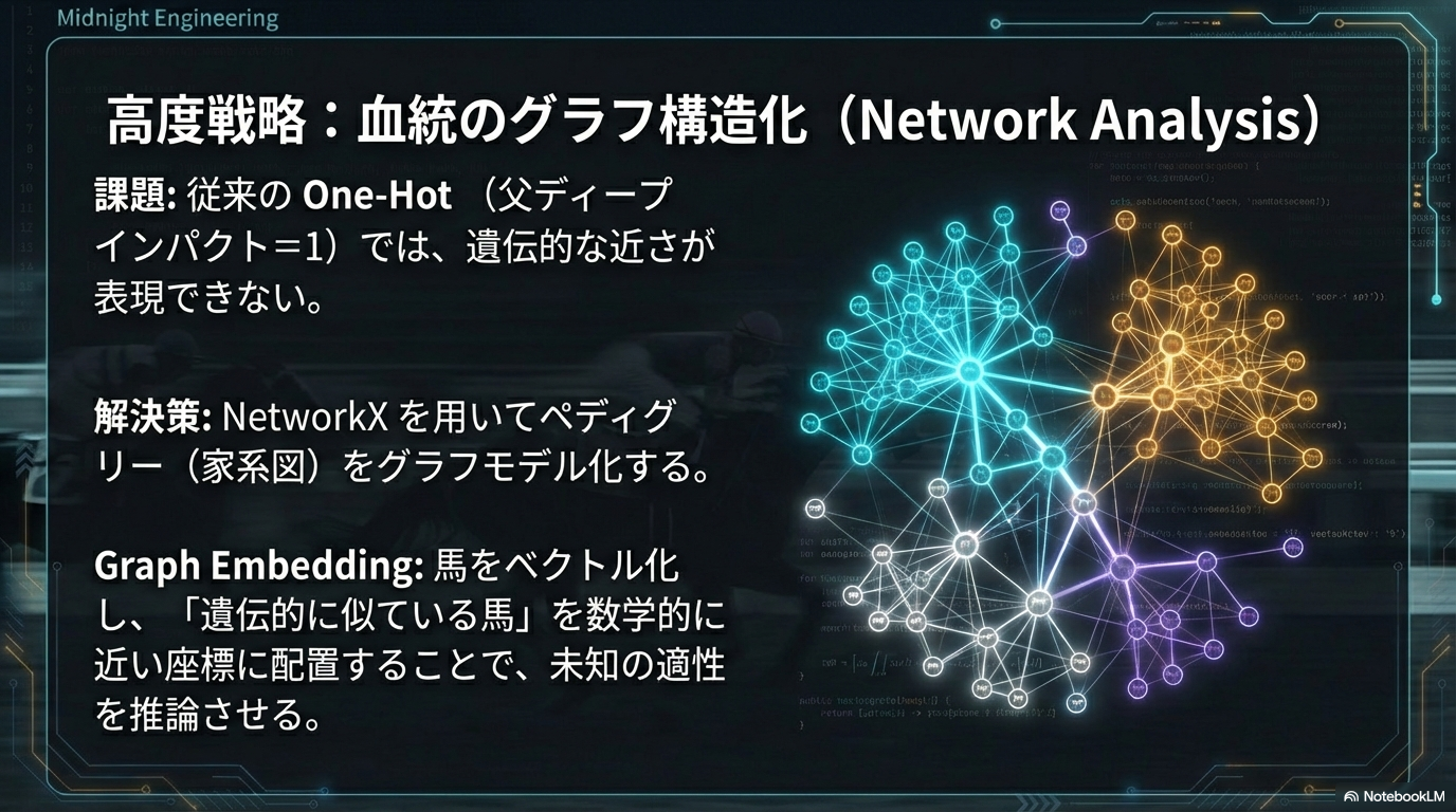 - 非構造化データの数値化: 「良血馬」という人間特有の感覚を、「中心性が高く、かつ成功した馬のベクトルに近い」という数学的な確信に変換できる。