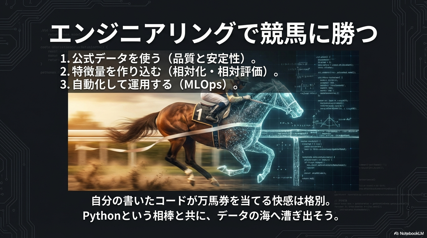 ぜひ、あなたもPythonという頼れる相棒と共に、競馬という広大で深淵なデータの海へ漕ぎ出してみてください。その先には、きっとエンジニアとして、そして投資家としての新しい景色が待っているはずです。