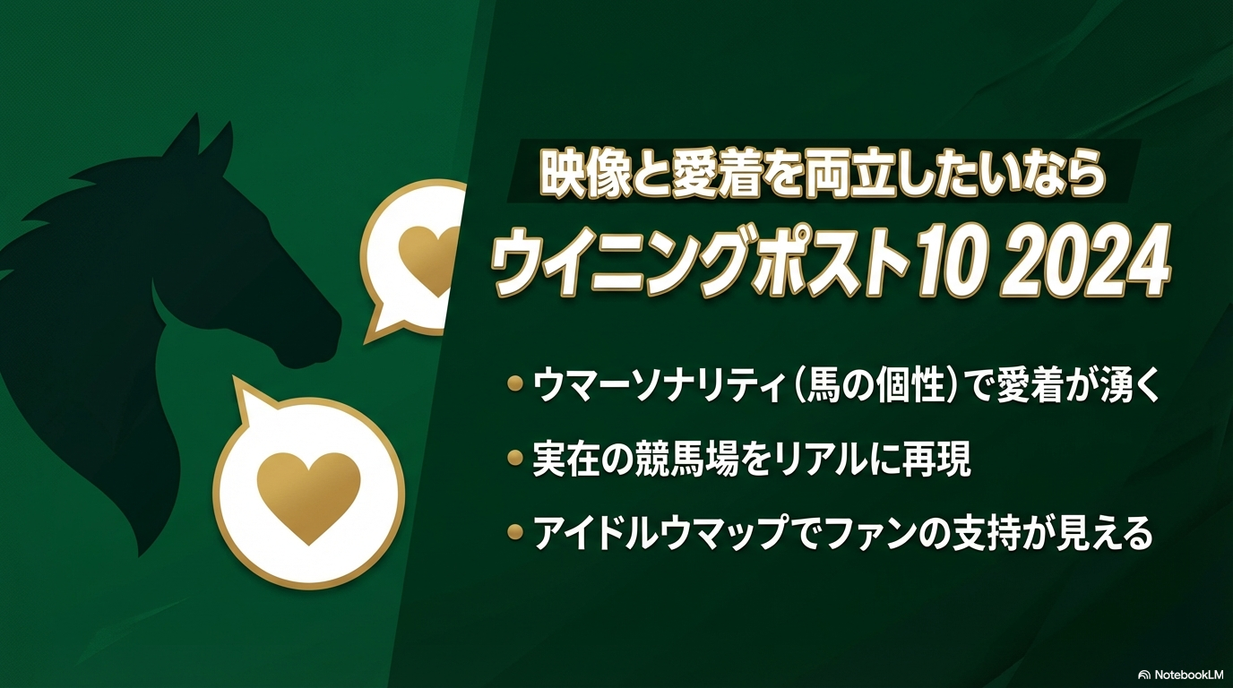 どちらを選んでも競馬の深みにハマること間違いなしですが、最新のグラフィックとデータを体験したいなら、やはり2026年の新作に注目すべきですね。正確な発売日や予約特典の詳細については、メーカーの公式発表を確認するようにしてください。(出典:コーエーテクモゲームス『Winning Post 10 2026』公式サイト