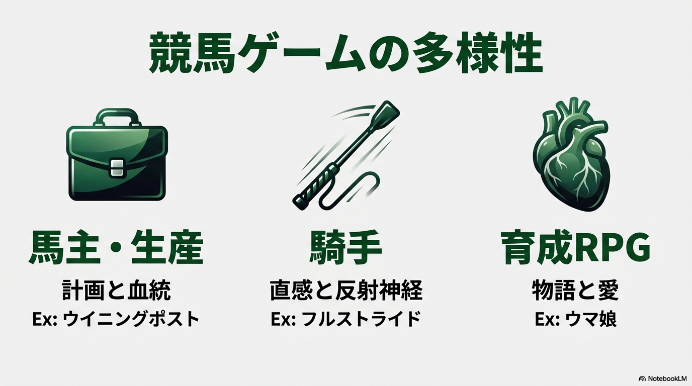 一口に「競馬ゲーム」と言っても、実は作品によってプレイヤーが担当する役割は驚くほど異なります。自分が馬主として牧場を経営するのか、それとも一人の騎手として風を切って走るのか。この選択を間違えると「思っていたのと違う…」となってしまうので、まずは代表的なジャンルの違いをしっかり押さえておきましょう。私自身、最初はどれも同じだと思っていましたが、遊んでみると「考える楽しさ」「動かす楽しさ」の明確な違いに気づきました。