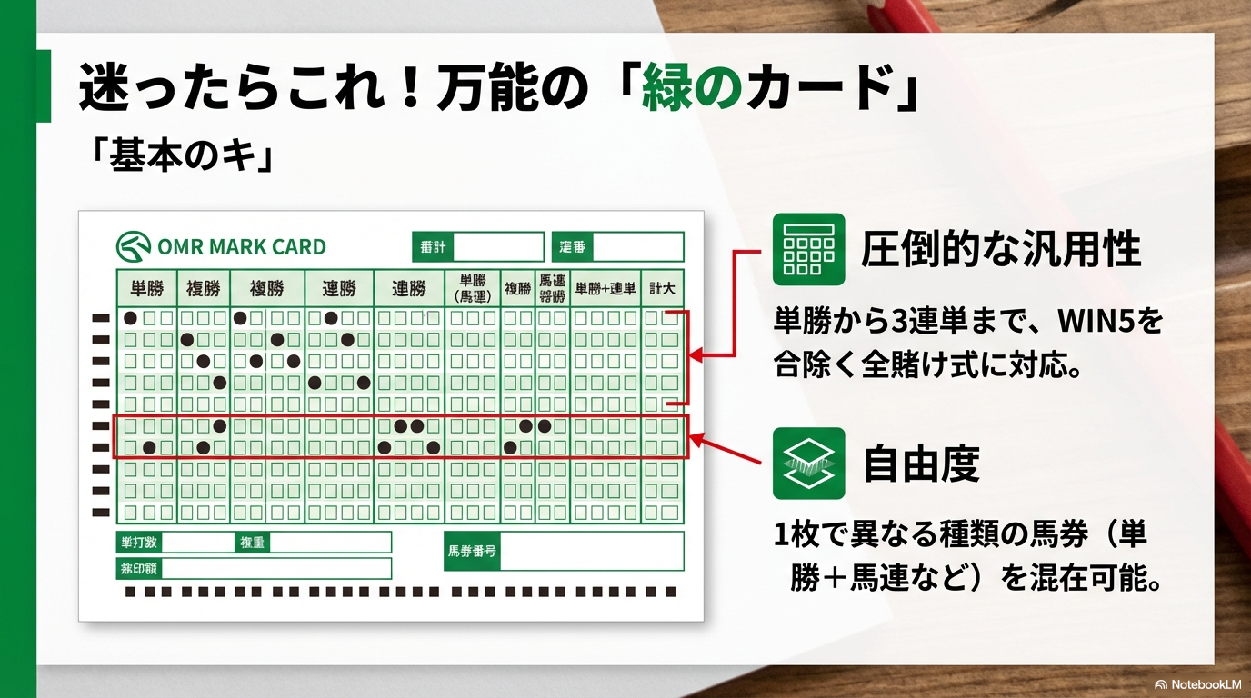 競馬場やウインズの記入台で最も目にする機会が多く、そして最も利用頻度が高いのがこの「緑のマークカード」です。もしあなたが「どのカードを使えばいいか分からない」と迷ったら、とりあえずこの緑のカードを手に取れば間違いありません。これはJRAのマークシートにおける「基本のキ」であり、ベテランの馬券師たちが愛用する万能ツールでもあります。
