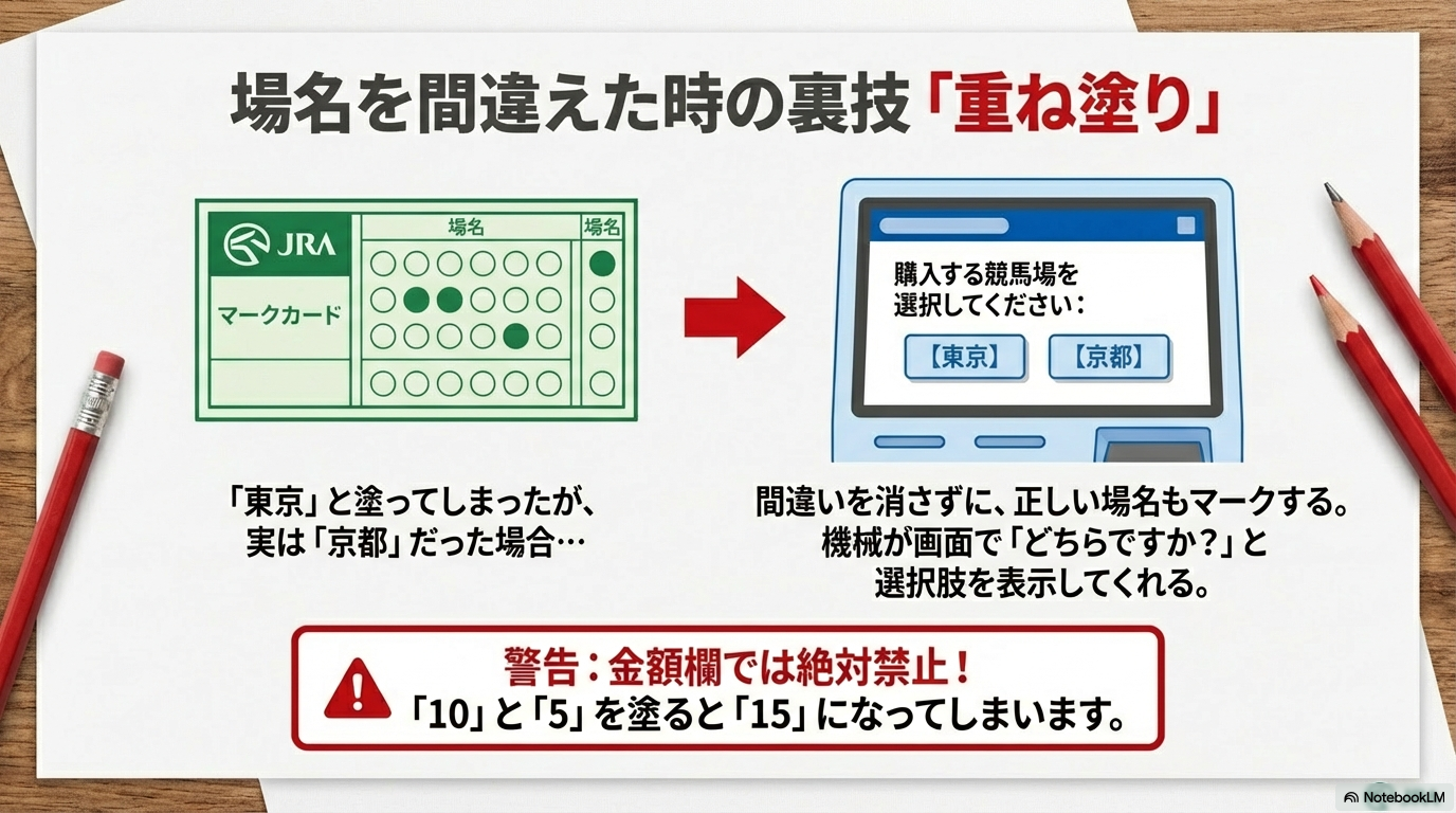 例えば、本当は「京都競馬場」の馬券を買いたいのに、うっかり「東京」をマークしてしまったとしましょう。この場合、通常なら新しいカードに書き直すか、その行を取り消して書き直しますよね。でも、すでにたくさんの買い目をマークした後だと、書き直すのが非常に面倒です。