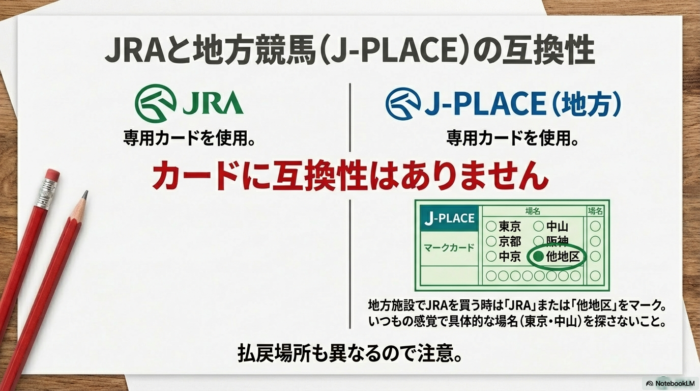 例えば、J-PLACE(地方競馬の施設でJRAの馬券を売る場所)では、基本的に「その地方競馬場の専用マークシート」を使ってJRAの馬券を買います。この時、場名欄には「東京」や「中山」がなく、代わりに「JRA」というマーク欄があることが多いです。手持ちのJRA緑カードを入れてもエラーになるので、必ず備え付けの専用カードを使用してください。(出典:JRA『自動発売機で馬券を購入する方法』)