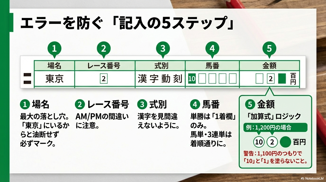 | 存在しない馬番 | 12頭立てのレースなのに「13番」以降を塗っているなど。 | 出馬表(新聞やスマホ)を再確認し、正しい馬番に書き直すか「取消」欄を使う。 |