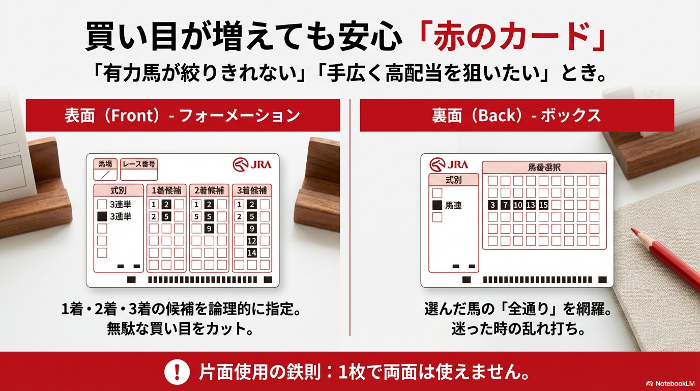 赤のカードは、表面が「フォーメーション」、裏面が「ボックス」専用に設計されており、複雑な買い目を驚くほど簡単に記入することができます。このカードの仕組みを理解することで、私たちは「組み合わせの計算」という面倒な作業から解放され、より戦略的な予想に集中できるようになるのです。