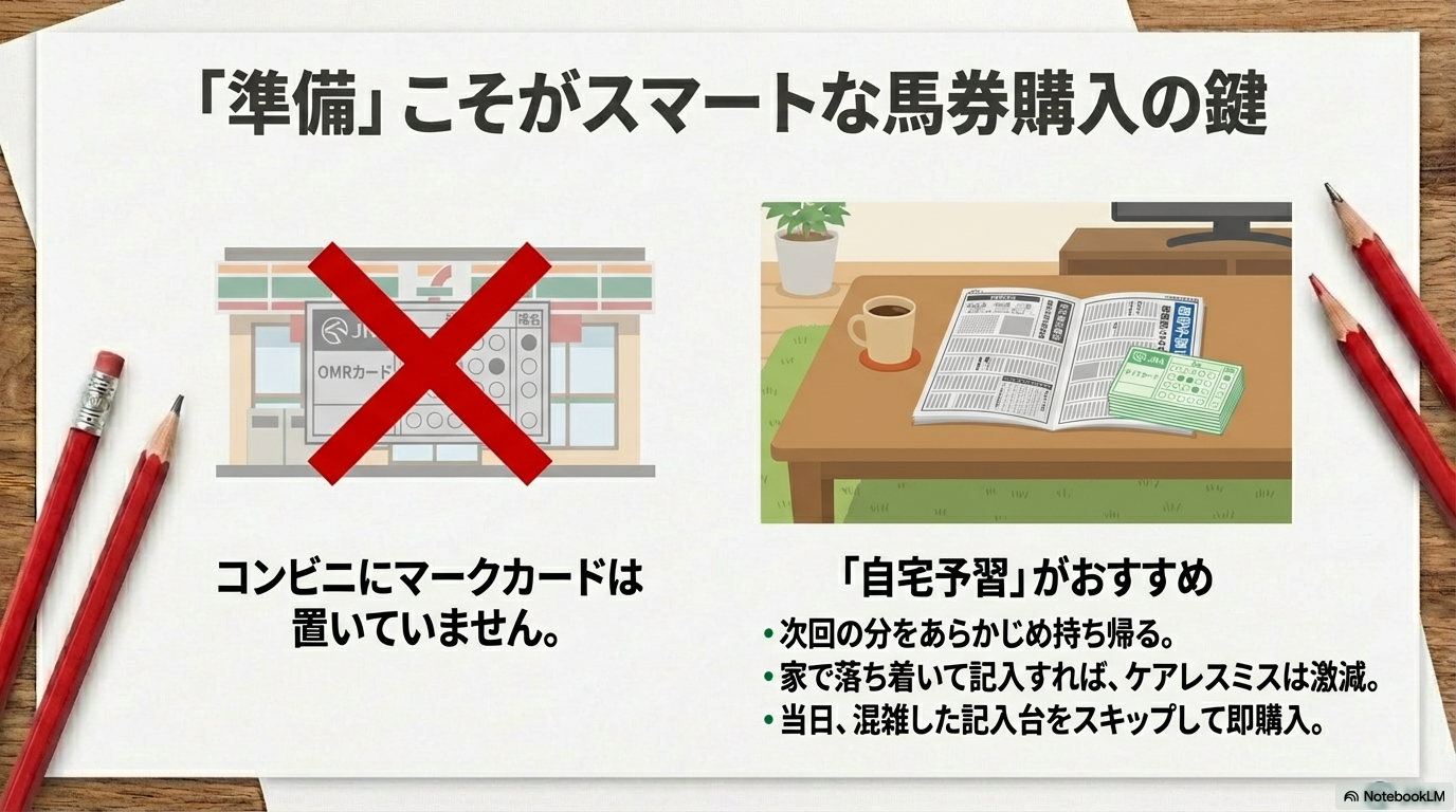 - ミスが減る:「場名」や「レース番号」の塗り間違いは、焦っている時ほど起こります。前日にゆっくり準備しておけば、ケアレスミスを激減させることができます。