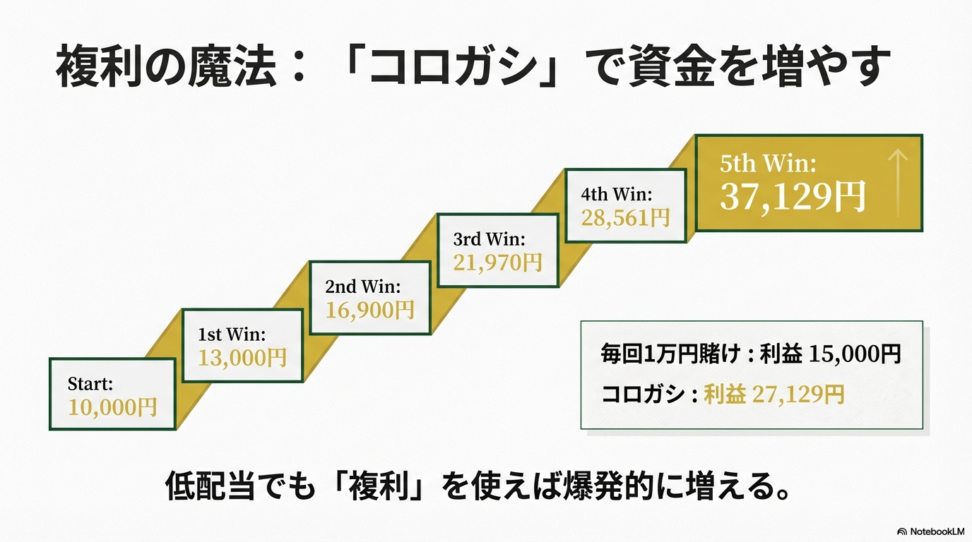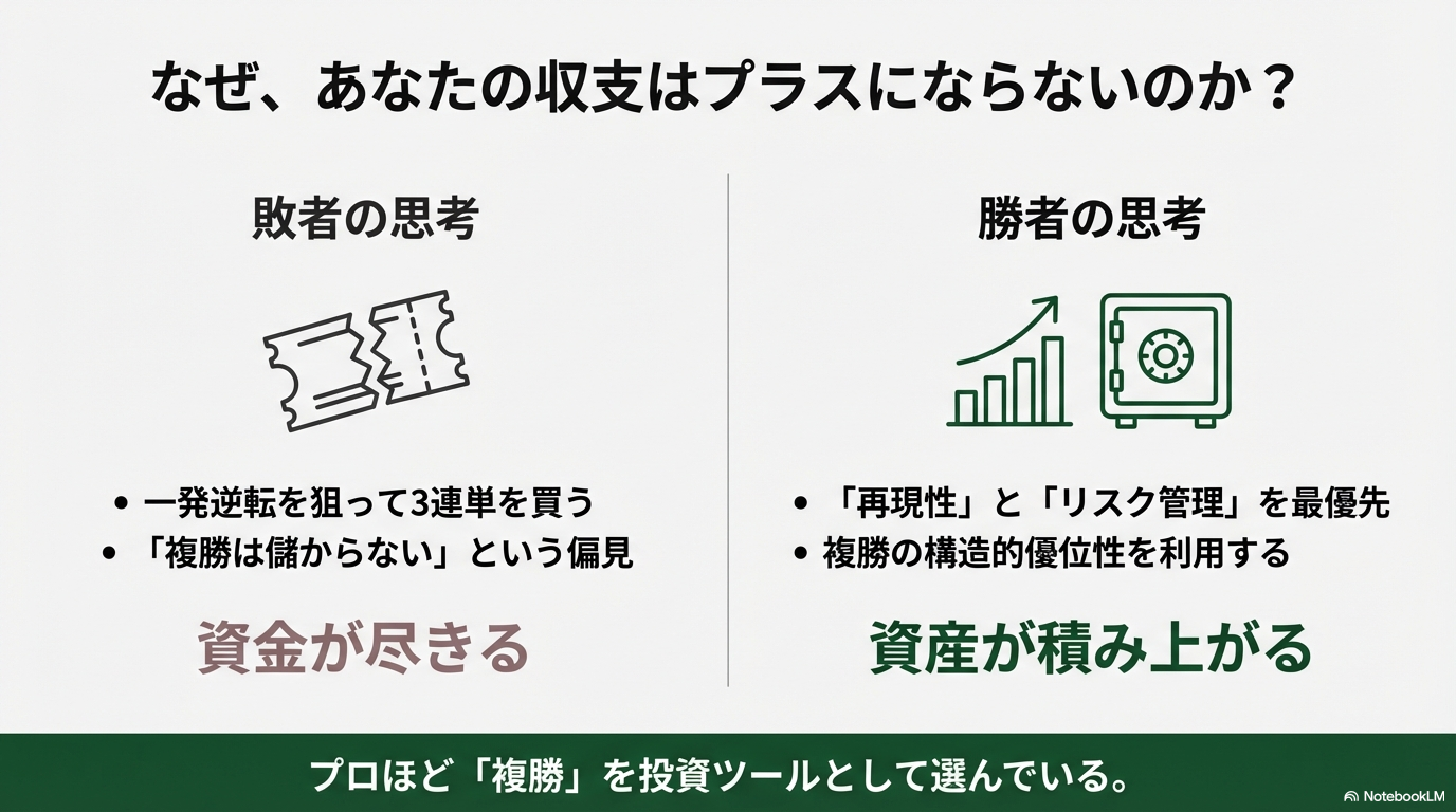 多くの人が「配当が低い」「地味だ」と言って複勝を敬遠します。しかし、投資の世界で重要なのは「一撃の大きさ」ではなく「再現性」「資金の生存率」です。どれだけ大きな夢を見ても、当たらなければゼロ円。逆に、小さな利益でも確実に積み上げ、複利の力を使えば、やがてそれは大きな資産となります。