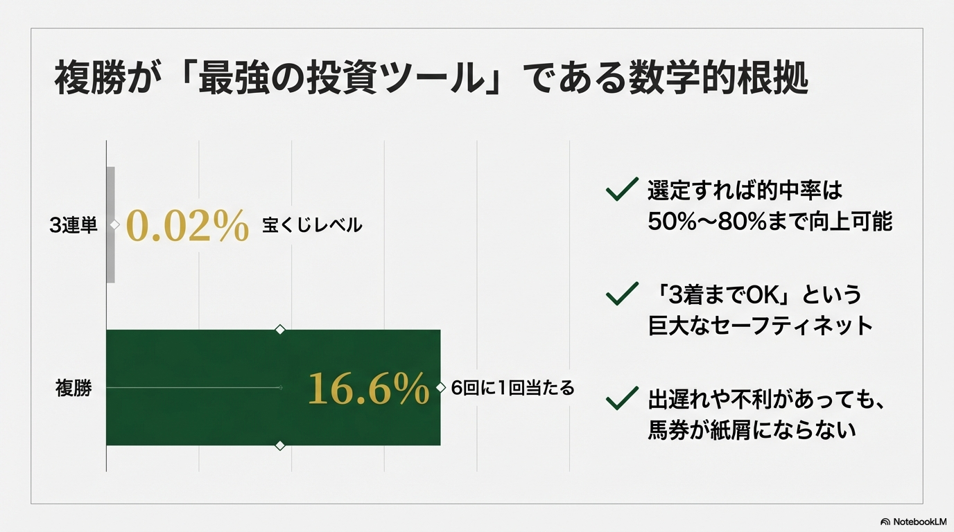 なぜ私がこれほどまでに複勝を推すのか。その理由は、単なる「当てやすさ」だけではなく、数学的な優位性とリスク管理のしやすさにあります。ここでは、その構造的な強さを3つの視点から深掘りして解説します。