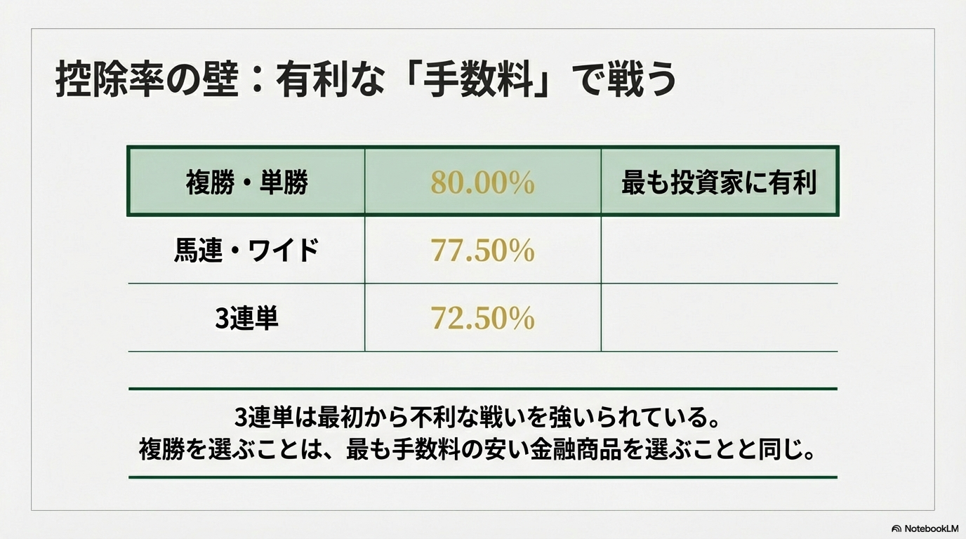 • 構造的優位性の理解:なぜ複勝が「最強の投資ツール」になり得るのか、その数学的・統計的な根拠(JRAの控除率や的中確率の観点から)。