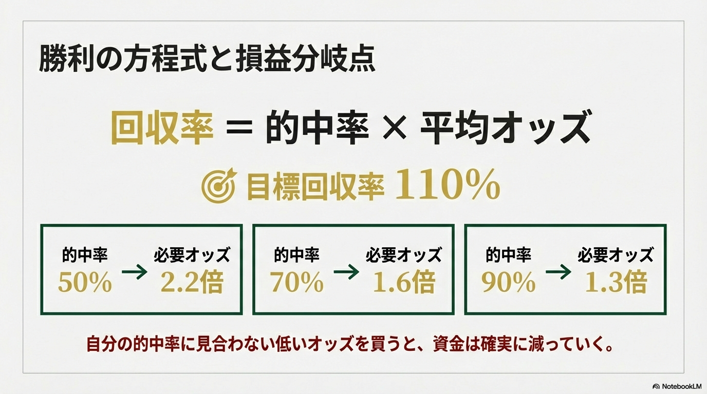 継続的に利益を出すために必要なのは、「自分の的中率から、必要なオッズを逆算する」という思考プロセスです。ここでは、複勝投資を成功させるための数学的な公式と、具体的な戦略について深掘りします。