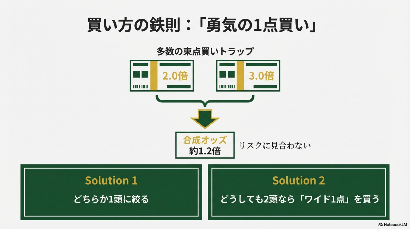 不安だからといって保険をかける「多点買い」は、あなたの利益を食いつぶすシロアリです。自信のある1頭が見つからないなら、そのレースはパスする。買うなら、勇気を持ってその1頭と心中する「スナイパー・アプローチ」を貫きましょう。