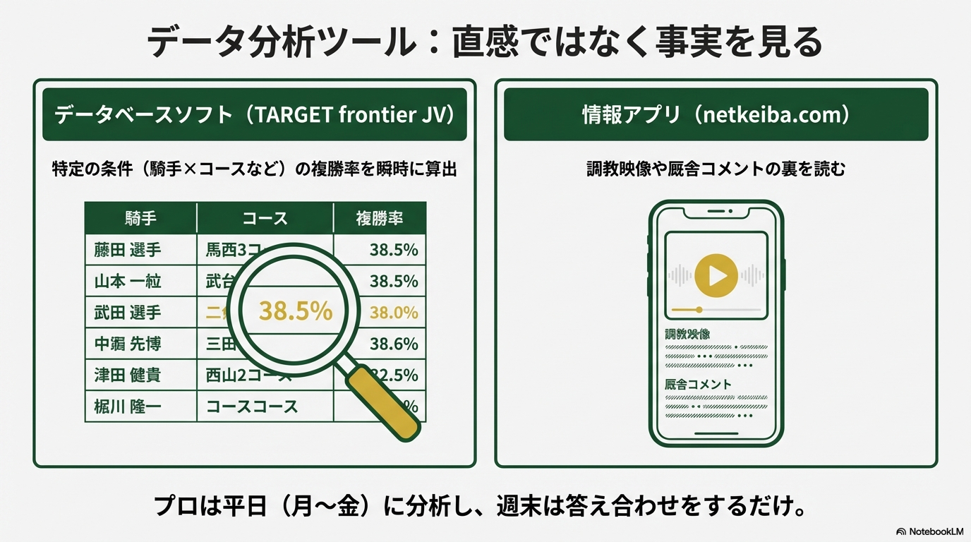 • プロの選球眼:「見(ケン)」することの重要性と、勝てるレース(8頭以上など)を見極めるためのフィルタリング技術。