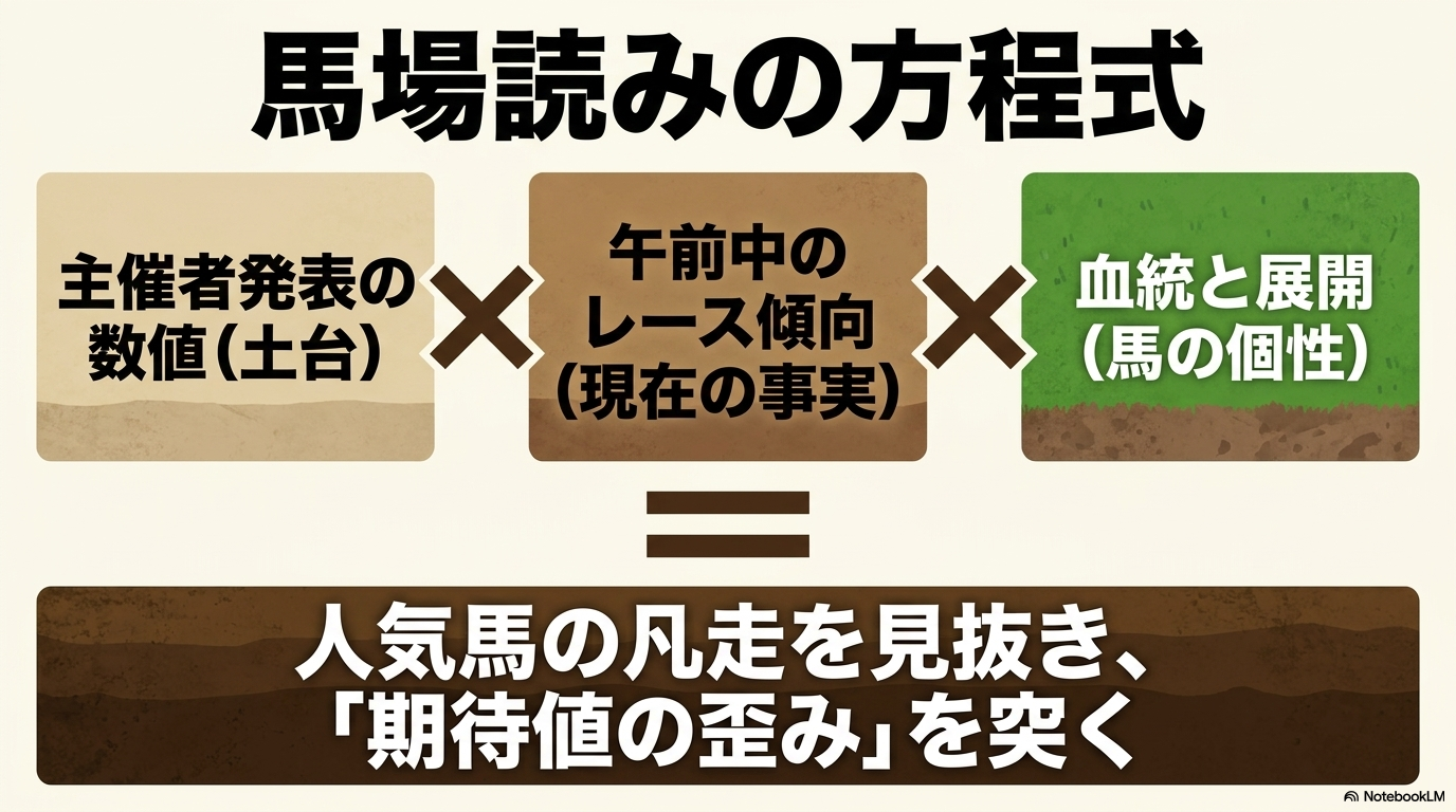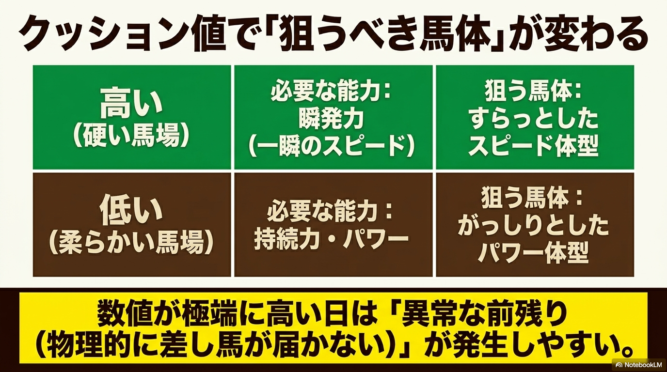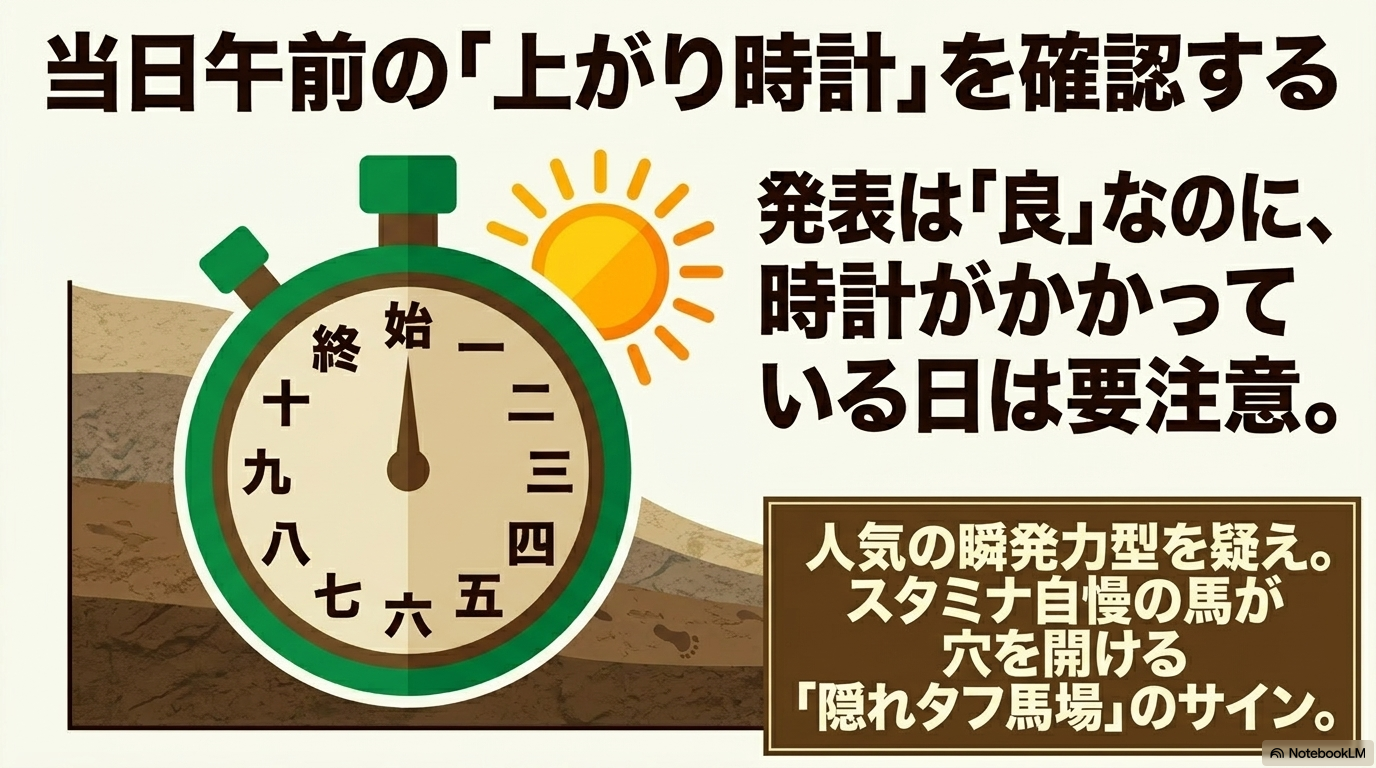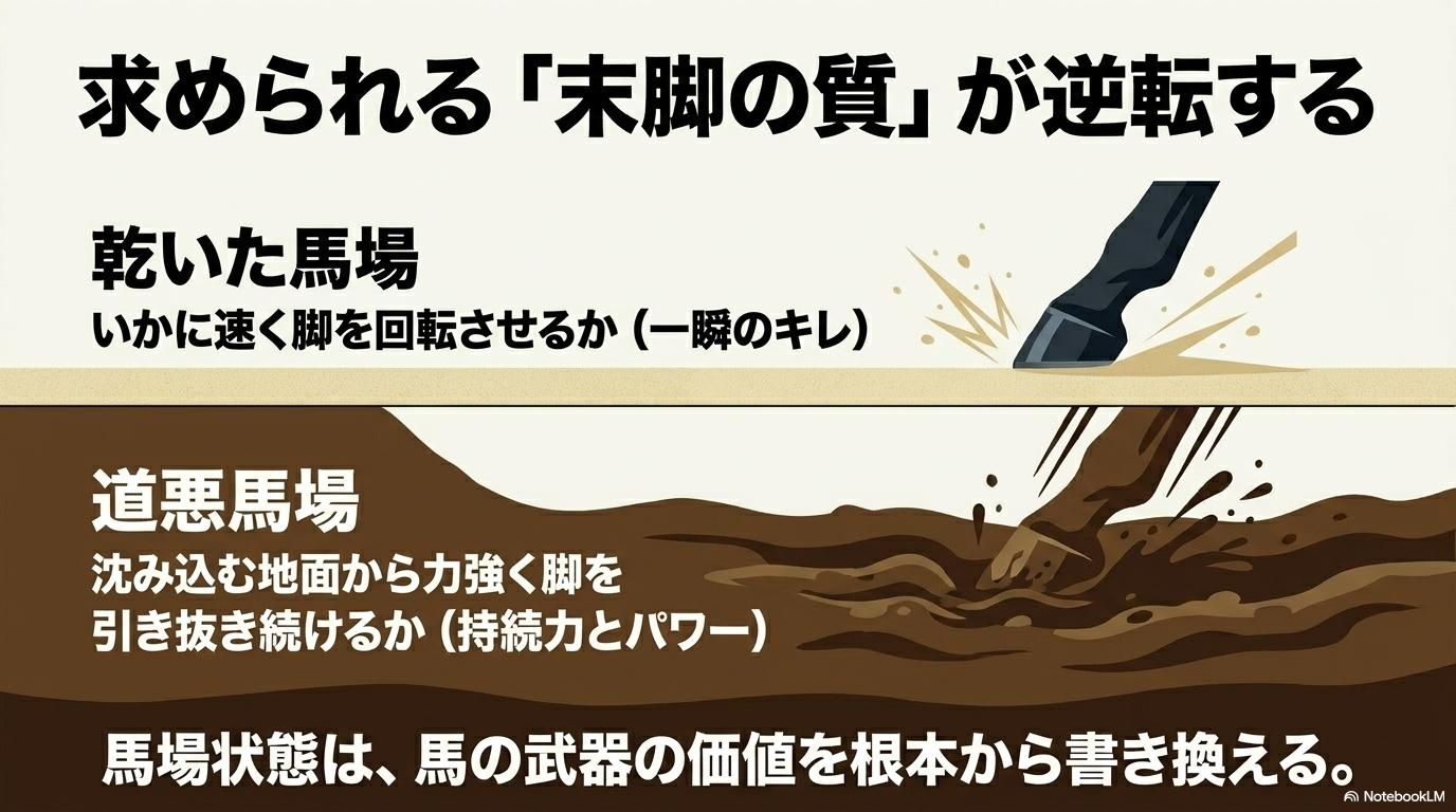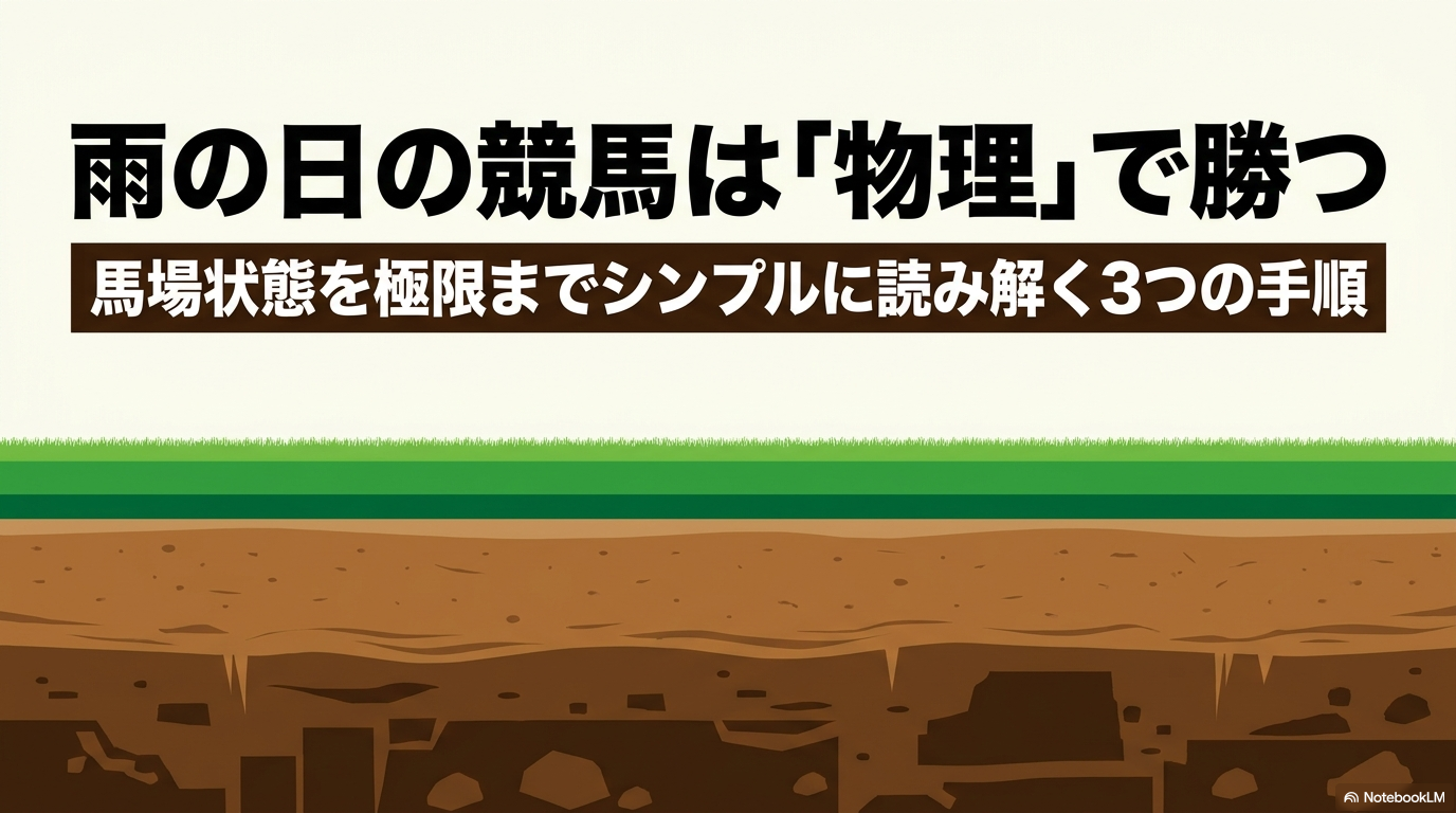 - 芝は「タフ化」、ダートは「高速化」: 水分によって芝は地盤が緩んでエネルギーを吸収し、ダートは砂の粒子が締まって脚抜きが良くなるという正反対の挙動を理解する。
