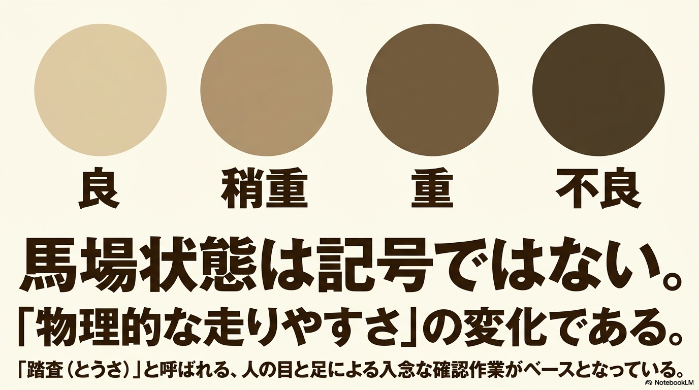 まずは、私たちが馬券を買う際に必ず目にする「公式発表」の裏側にある、馬場状態の基本的な仕組みからじっくり紐解いていきましょう。
