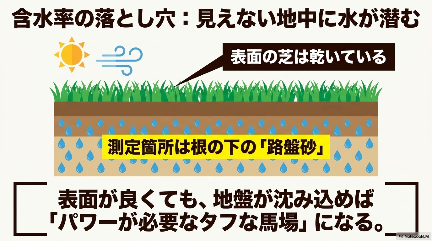 芝コースのレースにおいて、私が最も注目している指標の一つが「含水率」です。これは地中に含まれる水分の割合を数値化したものですが、芝のレースではこの数字が上昇すればするほど、走破タイムが遅くなり、究極の瞬発力が求められる「上がりの速い決着」になりにくくなる傾向があります。物理的なメカニズムを解説すると、水分を含んだ地盤は柔らかくなり、馬が踏み込んだ際にエネルギーを吸収する「スポンジ」のような役割を果たしてしまいます。これを競馬用語で「ノメる」と呼びますが、地面を蹴り出す力が逃げてしまうため、スピードスターたちの自慢の末脚が封じられてしまうのです。