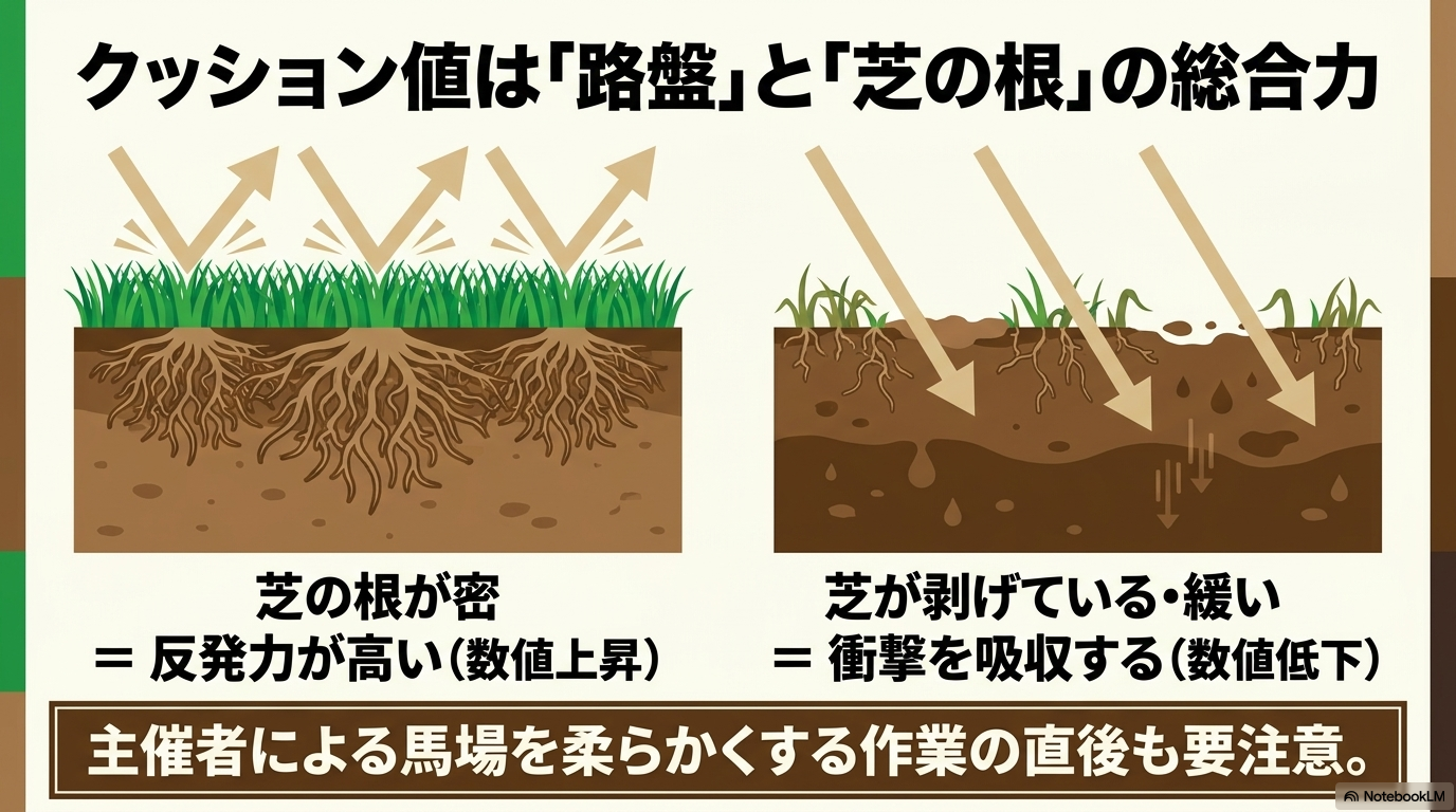 重要なのは、この数値が「路盤の締まり具合」だけでなく、「芝の生育状況」までも反映しているという点です。例えば、芝の根がびっしりと密に張っていれば、地盤がしっかりと支えられるため、反発力が高まり数値は上昇します。逆に、芝が剥げて土が露出していたり、雨で路盤が緩んでいたりすると、衝撃が吸収されて数値は低くなります。含水率が「路盤砂(土台)」の状態を示すのに対し、クッション値は「表面の芝と土台」を合わせた、馬が実際に受けるコンディションをより多角的に表現していると言えるでしょう 。