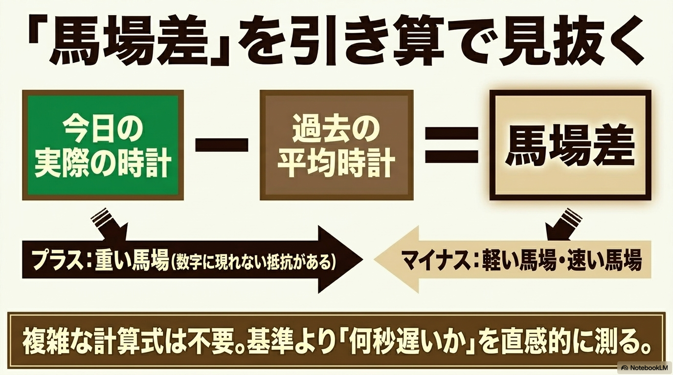 しかし、実戦では「限りなく稍重に近い良馬場」もあれば、「超高速のパンパンの良馬場」も存在します。この微妙なニュアンスを数値化するのが、タイム指数のリアルタイム補正です。 私がよく実践しているのは、当日の午前中のレース結果から「馬場差(Track Variant)」を算出する方法です。公式発表が「良」であっても、実際の走破タイムが想定される基準タイムよりも1秒以上遅い場合、そこには数字に現れない抵抗、すなわち「隠れたタフ馬場」が存在していると考えます。具体的には、以下の数式を用いてその日のコンディションを定量化します。