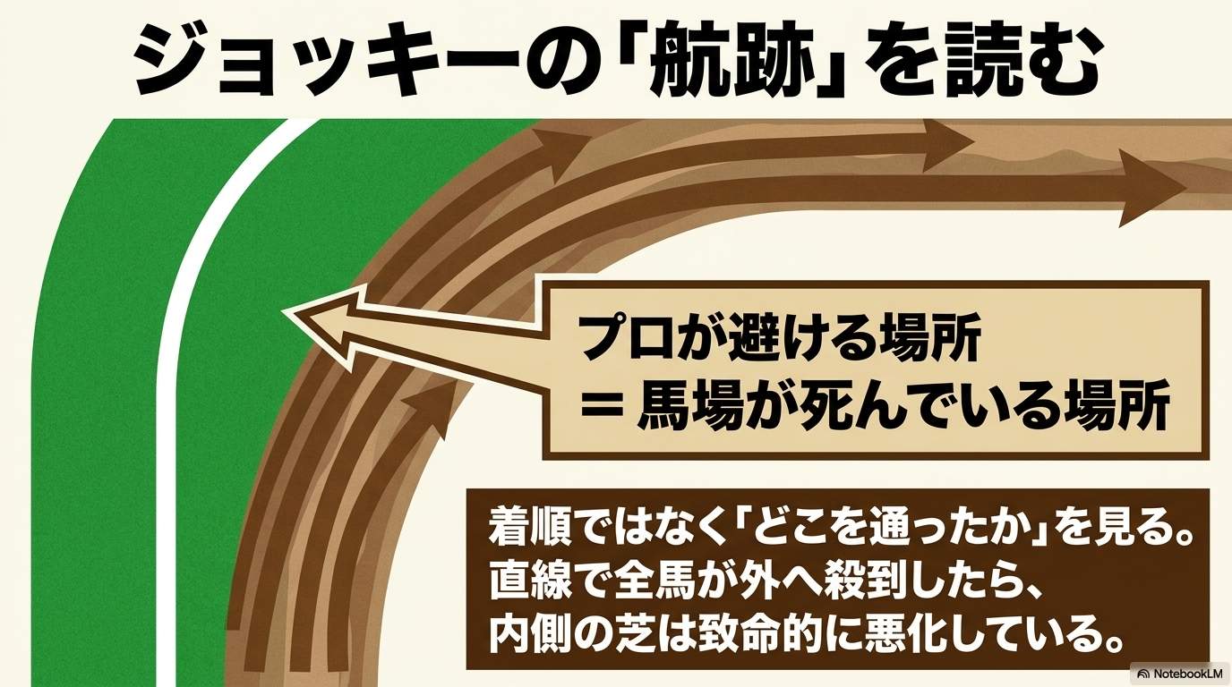 この芝の初戦こそが、私たち馬券購入者にとっての「宝の山」なんです。 トップジョッキーたちは、レース前の返し馬や、コースを歩いて行う事前のチェックによって、どこが最も伸びるかを物理的に探っています。もし、直線に向いた瞬間に全馬が内ラチを5メートル以上開けて、馬場の真ん中から外側に殺到するようなら、それは「内側の芝が致命的に悪化している」という、実際に走っているプロたちが出した回答そのものです 。