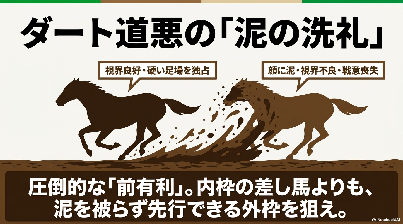 - 精神的要因: 前の馬が跳ね上げる泥(キックバック)が顔にかかるのを嫌がり、追い込む意欲を削がれる馬が多いため。