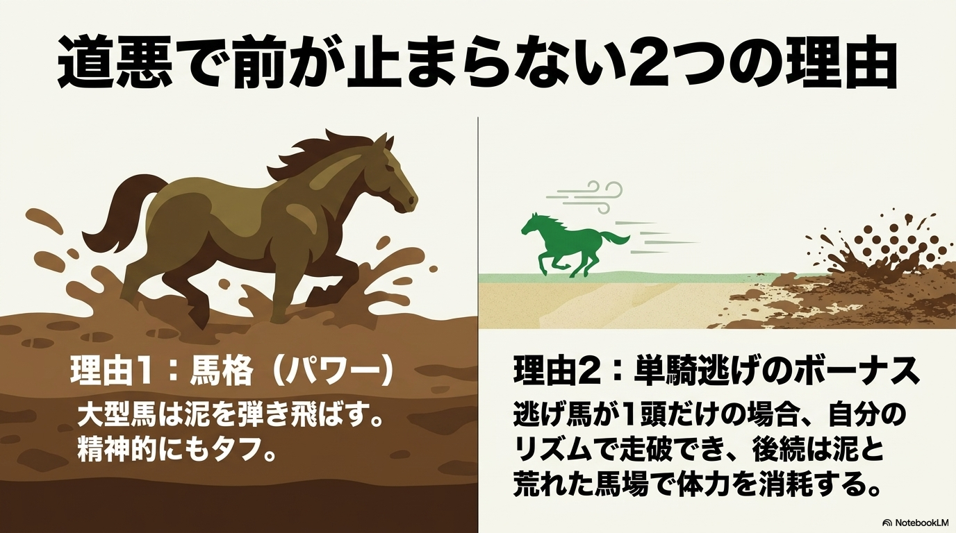 視界が遮られ、顔にベタベタと泥がつくのを嫌がる馬は、そこで一気に戦意を喪失してしまいます。一方で、逃げ馬や番手の馬はきれいな視界の中で、硬く締まった走りやすい足場を独占できるわけです。この「精神的ストレスの差」が、ダート道悪における圧倒的な前有利のバイアスを形成しています。 私が予想する時は、逃げ馬だけでなく、馬格のある馬も重視します。