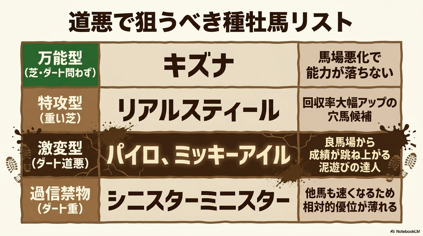- 道悪専用の特注データ: キタサンブラックやドレフォンといった「道悪の鬼」血統と、泥の沈み込みを最小限に抑える「ピッチ走法」の馬をセットで狙う。