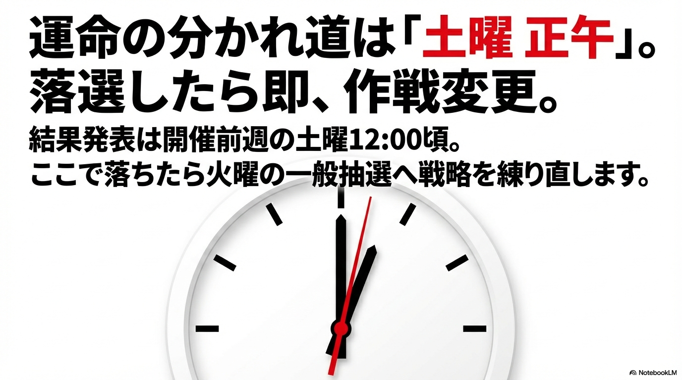 - 土曜12:00の結果確認は、落選後の「一般抽選」への作戦会議の始まりと捉える。
