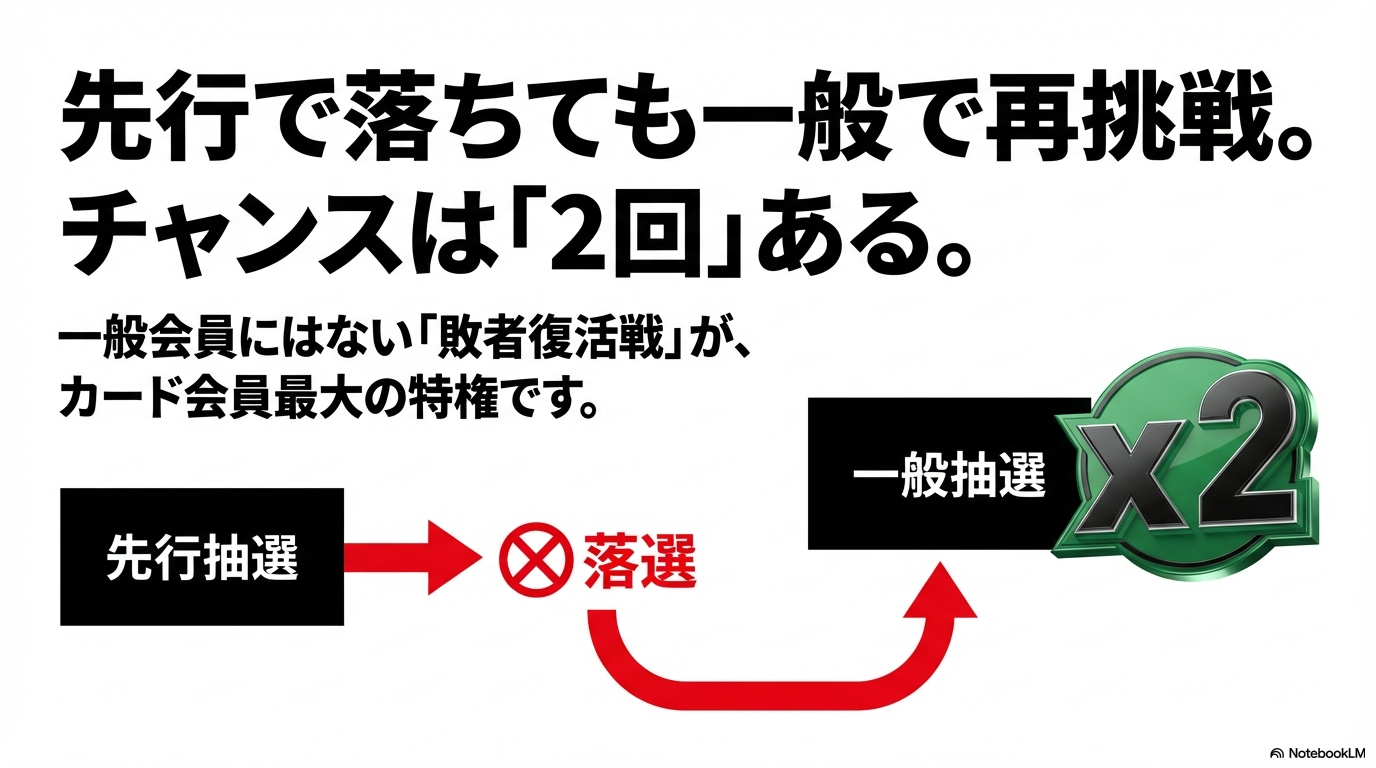 先行抽選の優位性は、単なる倍率の数字だけではありません。システム上、JRAカード会員には「落選しても敗者復活戦がある」という構造的な強みがあります。先行抽選で一度ふるいにかけられた後、まだ席が残っている場合や一般枠の募集が始まった際に、カード会員はそのまま一般抽選にも申し込むことが可能です。一方で、カードを持っていない一般会員にはこの「一回目」のチャンスすら与えられません。