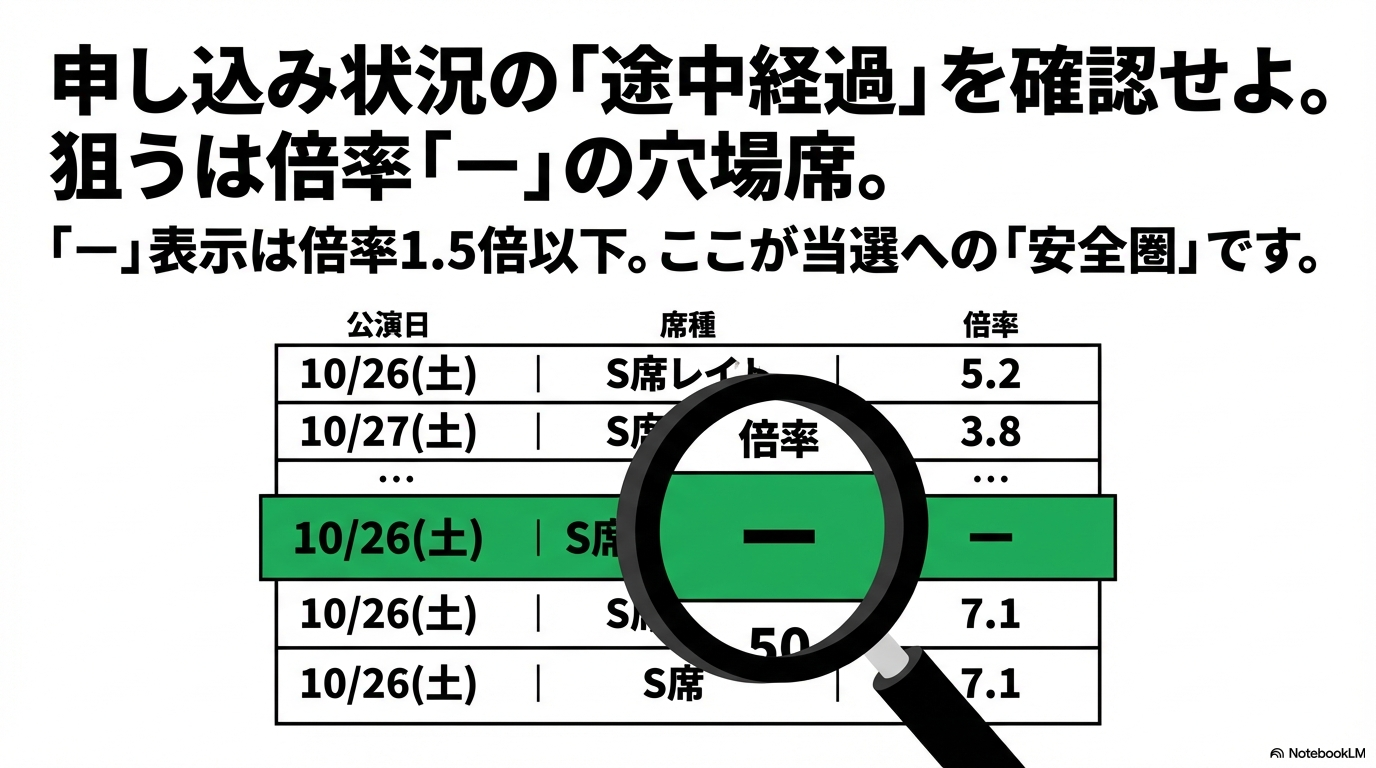 - 土曜正午のルーティン化:先行抽選の結果更新を逃さずチェックし、落選時は即座に一般抽選の戦略(席種の変更など)に切り替える準備ができていますか。