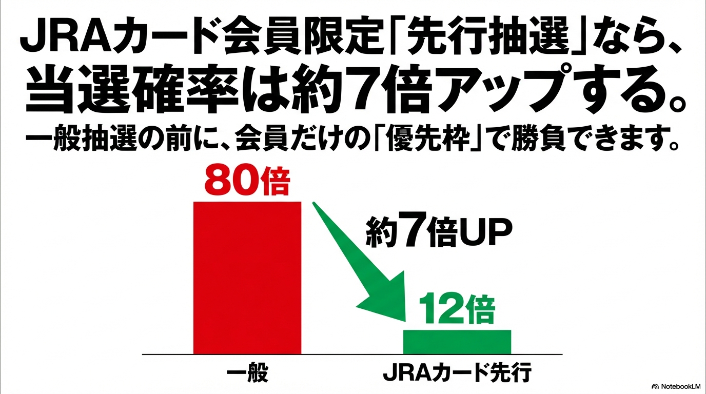表を見ると分かる通り、有馬記念の一般抽選での最高倍率81倍という数字は、当選確率に直すとわずか1.2%という、宝くじのような確率です。一方で、先行抽選なら12倍程度。これでも厳しいですが、当選確率は8.3%まで跳ね上がります。つまり、JRAカード会員になるだけで、当選の可能性が約7倍も高まるということなんです。この差を「たった数パーセント」と見るか、「決定的なアドバンテージ」と見るかで、競馬ライフの質は大きく変わりますよね。