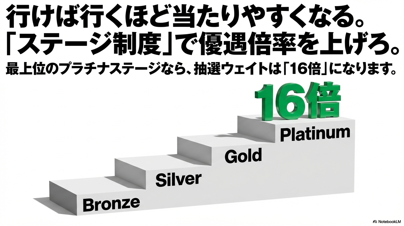 このステージ制度の最大の特徴であり、私たちが目指すべき到達点は、最高ランクである「プラチナステージ」です。その優遇内容はまさに破格。なんと、通常の抽選権に対して最大16倍もの重み付けがなされるんです。