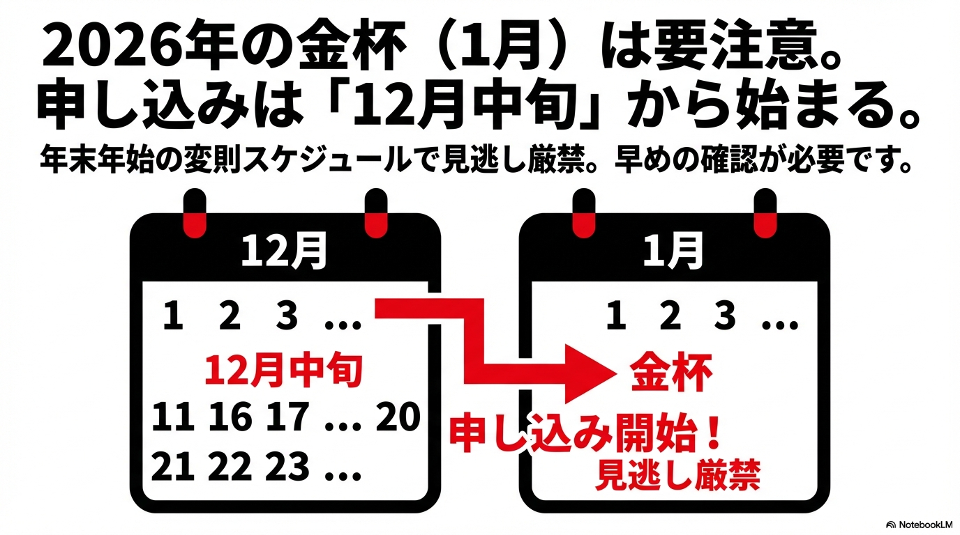 - 2026年金杯などの変則開催時は、12月中旬から早めにスケジュールを確認しておく。
