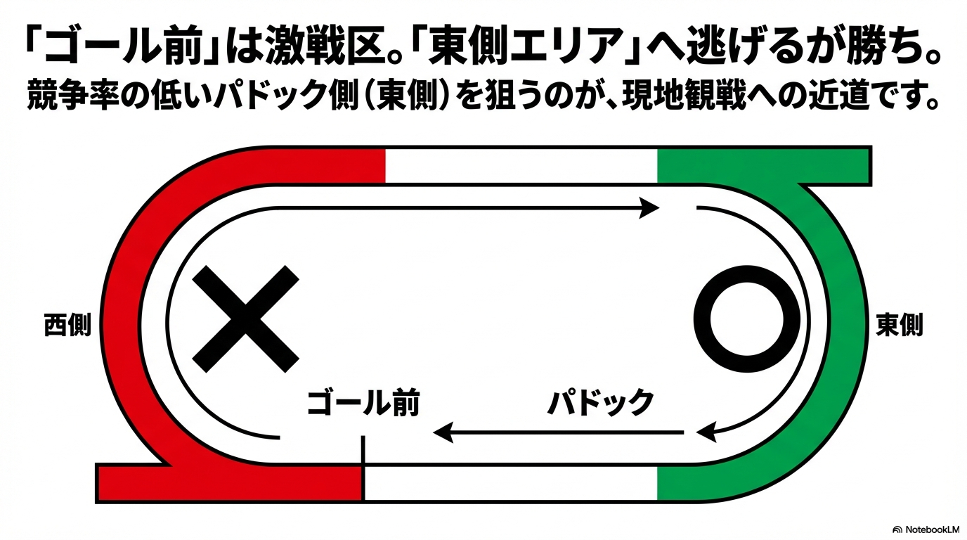 私が実践している「確実に現地へ行くための席選び」は、一言で言えば「需要の隙間を突く」ことです。どの席でも入場してしまえば、生でパドックを見たり、場内の雰囲気を楽しんだりすることは可能です。ここでは、具体的なデータを交えながら、当選確率を極大化するためのエリア・階層・グレードの選び方を深掘りしていきましょう。