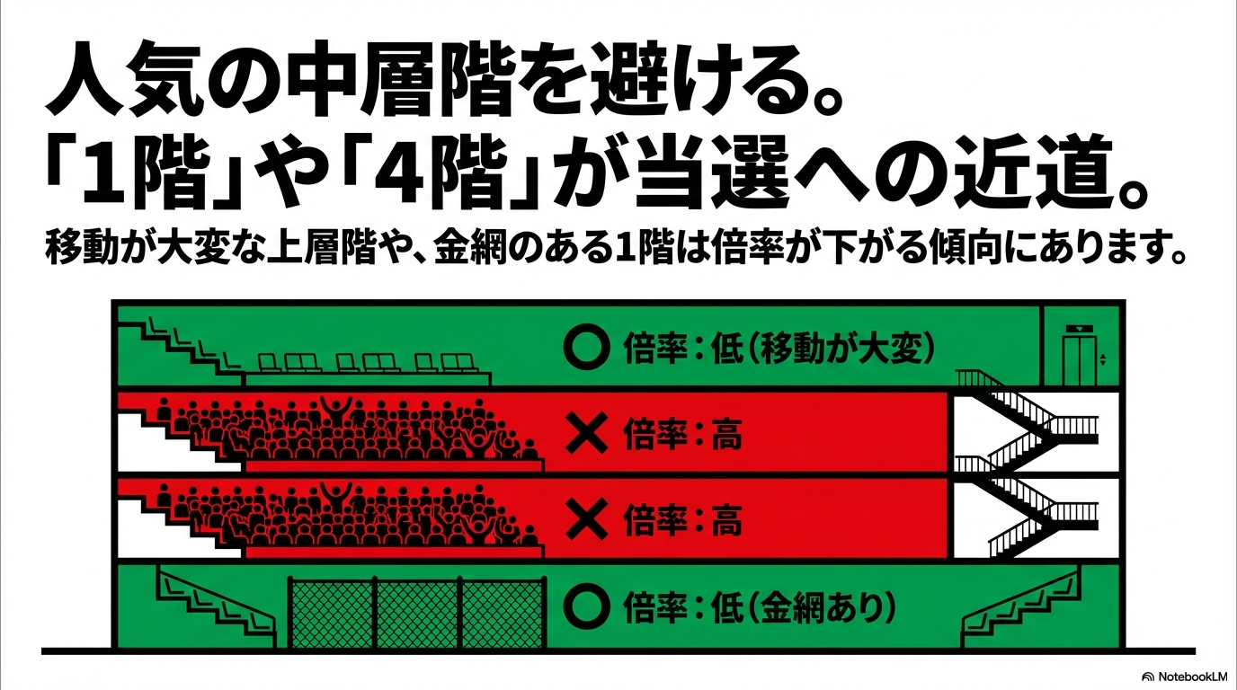 スタンドの「階数」選びにも、心理的なトラップが潜んでいます。多くの人が「2階や3階が、高すぎず低すぎずちょうど良い」と考えるため、中層階に申し込みが集中する傾向があるんです。実際のデータを見ても、2階・3階のスマートシートが12倍を超えている時に、1階席や4階席は10倍を切っているといった逆転現象がよく見られます。