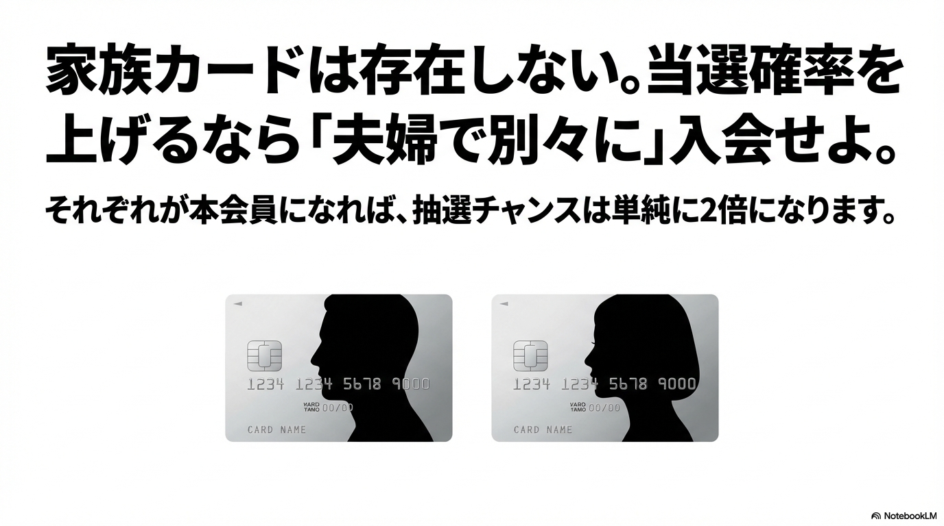 では、夫婦や親子で一緒に先行抽選に参加して、少しでも当選確率を上げたい場合はどうすればいいのでしょうか。答えはシンプルで、「家族それぞれが個別にJRAカードの本会員として入会する」という戦略が最も有効です。例えば、ご主人がDCブランドのJRAカード、奥様がNICOSブランドのJRAカードをそれぞれ本会員として持つ形ですね。これにより、1つの開催日に対して2人分の「先行抽選枠」を確保できるため、実質的な当選チャンスは2倍になります。もし一人が落選しても、もう一人が当選していればペアで観戦できるわけです。