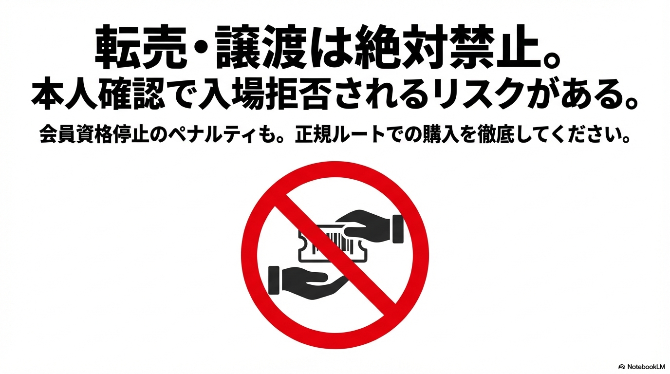 また、最近は転売対策が非常に厳しくなっており、入場時の本人確認が行われるケースも増えています。転売サイトなどで高額出品されているQRコードを購入しても、当日入場を拒否されるリスクが高いだけでなく、最悪の場合は会員資格の停止処分を受けることもあります。正当な方法で、粘り強く一般抽選やキャンセル分の残席発売を待つのが、結局のところ一番の近道かなと思います。