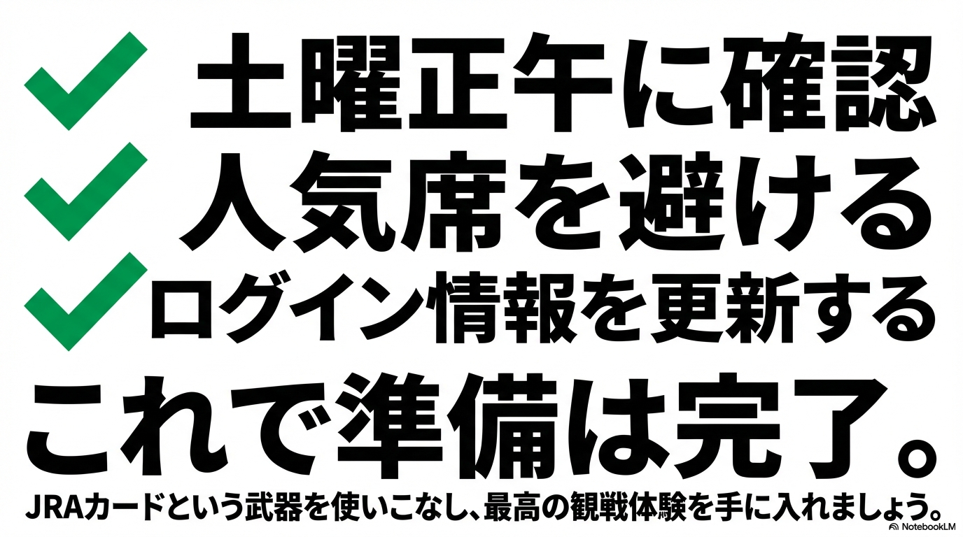 JRAカードという強力なパートナーを味方につけて、皆さんの週末が最高の観戦体験で満たされることを心から願っています。この記事で紹介した数字や傾向はあくまで執筆時点での目安ですので、実際に予約する際は必ずJRA公式サイトで最新のルールやスケジュールを確認し、最終的な判断をしてくださいね。それでは、またどこかの競馬場でお会いしましょう!
