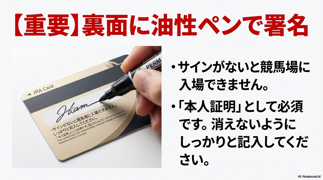 | 署名欄(サイン) | カード裏面の白い帯部分 | 競馬場現地での本人確認のため |