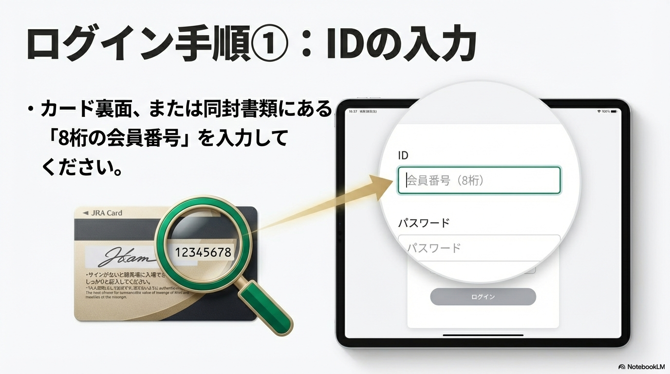 そして、多くの方が「何を入力すればいいの?」と迷うのがパスワード欄です。初回に限っては、ご自身が設定したパスワードではなく、JRA側で用意した仮パスワードとして「西暦8桁の生年月日(YYYYMMDD)」を入力します。例えば、1985年12月25日生まれの方なら「19851225」という数字8桁がパスワードになります。和暦(昭和や平成など)で入力したり、スラッシュ(/)を入れたりするとエラーになるので、必ず西暦の数字のみを入力してくださいね。