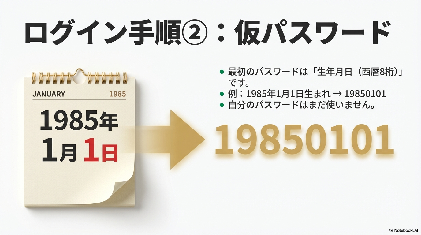 - 生年月日8桁を仮パスワードにして初回ログインを済ませる