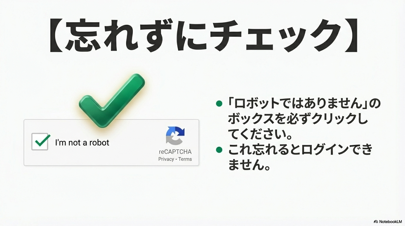 ログイン情報の入力欄のすぐ下にある「私はロボットではありません」のチェックボックス(reCAPTCHA)を、必ずクリックしてチェックを入れてください。実は、これを見落として「ログインできない!」と悩む方が非常に多いんです。このチェックを忘れると、正しい情報を入れていても画面が次へ進みません。
