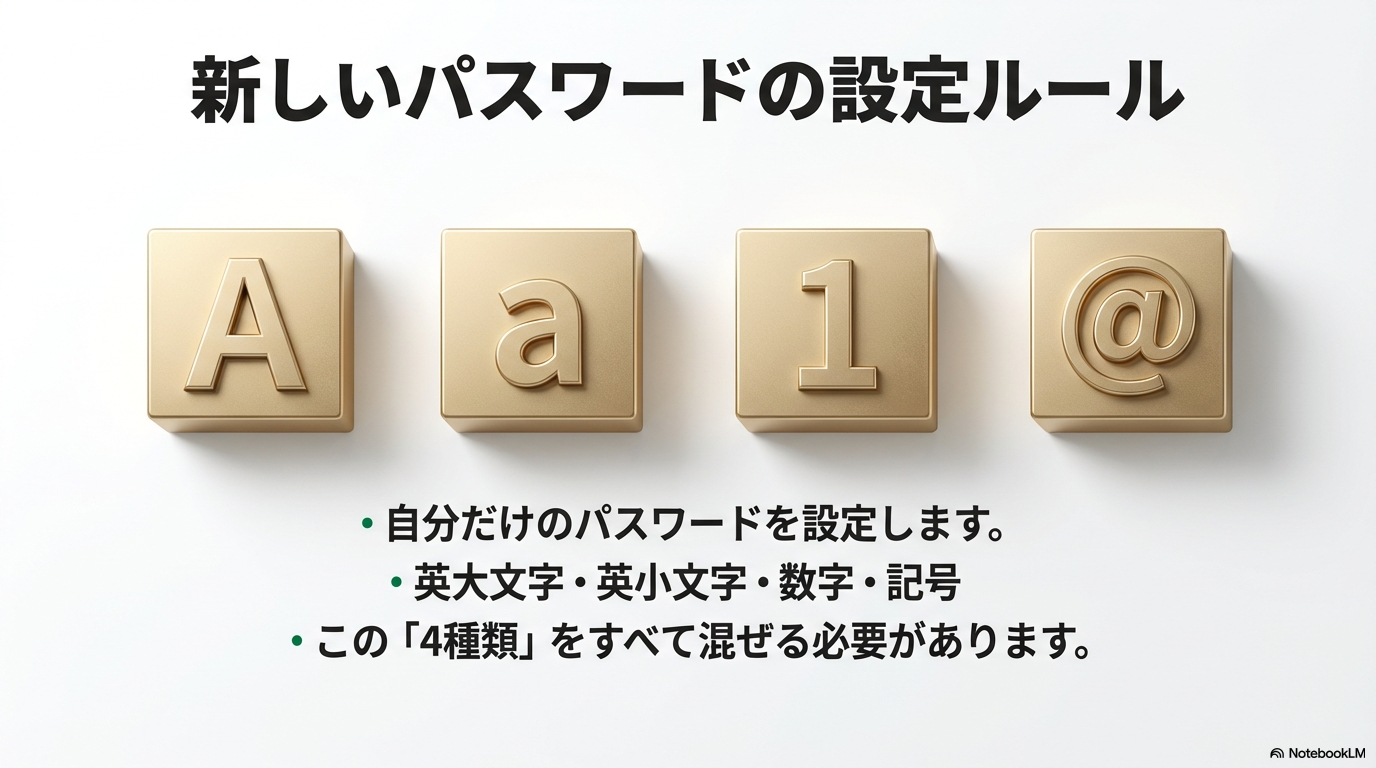 最後に、初回ログインが完了した後は、必ず「新しいパスワード」の設定を求められます。この新パスワードはセキュリティ強化のため、英大文字・小文字・数字・記号の4種類を全て混ぜる必要があります。このパスワード設定で苦戦する方も多いので、事前に候補を考えておくとスムーズですよ。