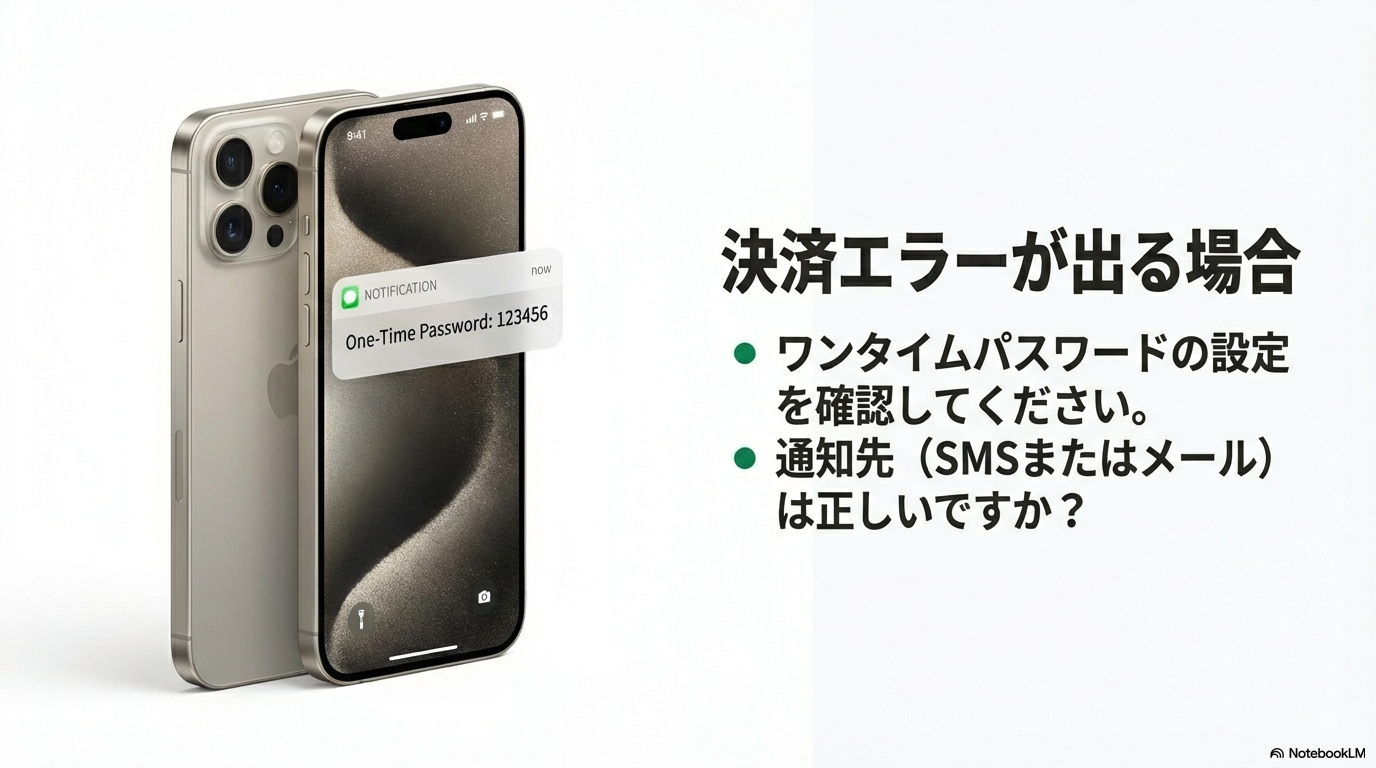 ここで一つ、非常に重要な注意点があります。3Dセキュアの認証に使うワンタイムパスワードの通知先情報が、カード会社側に正しく登録されていないと、決済の最終段階でコードが受け取れず、購入に失敗してしまいます。特に携帯電話を買い替えたばかりでSMSの設定が古いままだったり、キャリアメールのフィルタリング設定を強固にしすぎていたりと、利用者側の受信環境に起因するエラーが多発しています。