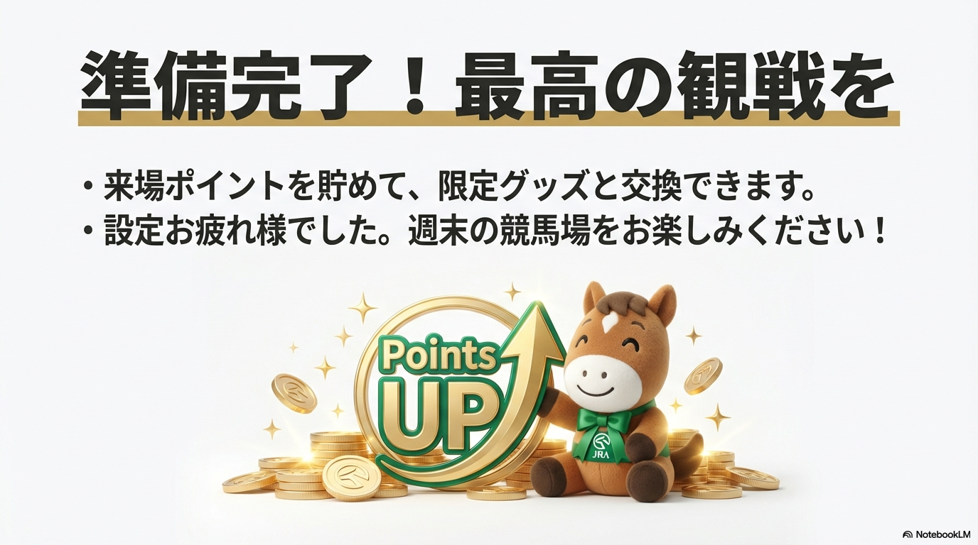このように、土曜日の朝イチに来場するのが最もポイント効率が良いんです。この来場ポイントが積み重なると、ランクが上がって豪華な景品が当たる抽選会に参加できたり、指定席招待券に引き換えられたりと、次回の競馬ライフがさらに楽しくなります。せっかく高い当選倍率を潜り抜けて確保した席ですから、こうした実績もしっかり積み上げていきましょうね。