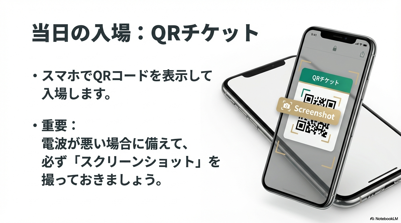 ここで私から皆さんに強くお伝えしたいアドバイスがあります。絶対に「QRコードのスクリーンショット」を事前に撮っておいてください!競馬場、特にG1レースが開催されるような日は、数万人という人が密集するため、スマートフォンの電波が極端に繋がりにくくなることが本当によくあります。いざ入場門の前でサイトを開こうとしても、「読み込み中」のまま動かず、後ろに行列ができて冷や汗をかく……なんて事態は避けたいですよね。あらかじめスクショを撮って「写真」アプリに保存しておけば、オフラインの状態でもサッと提示できますし、バッテリーの節約にもなります。