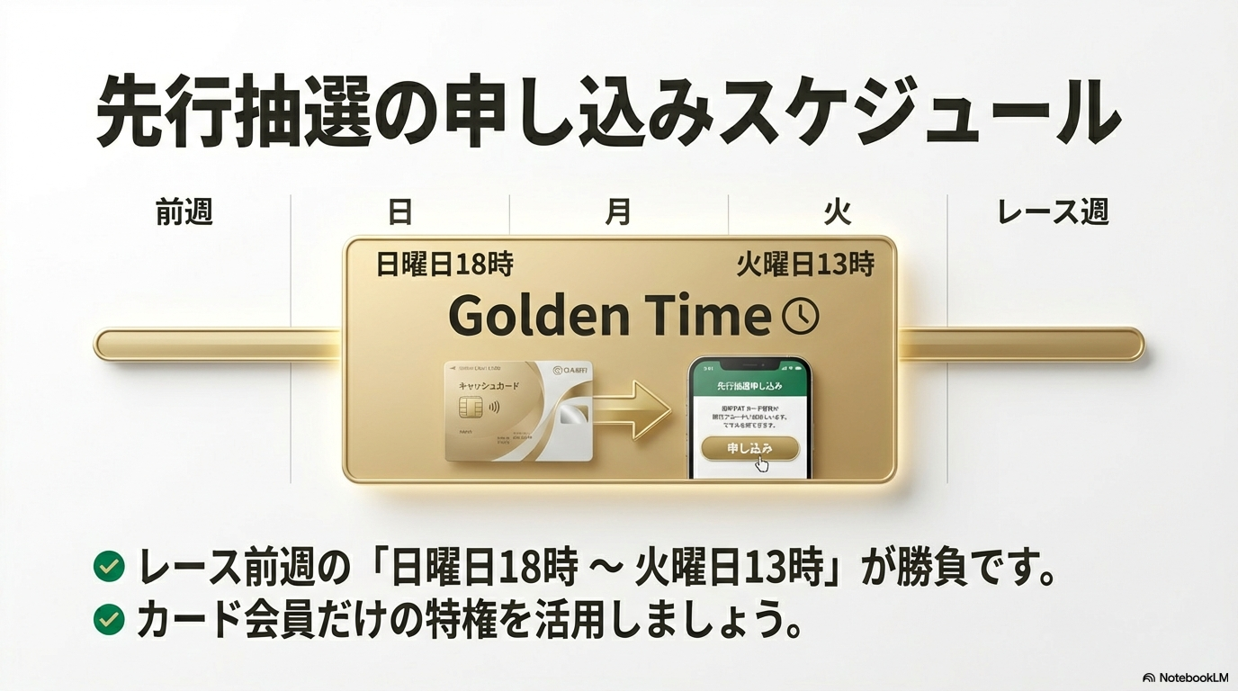 まずは物理的なカードへの署名を行い、次にネット予約サイトでの初回ログイン登録、そして決済に必須の3Dセキュア(本人認証サービス)の登録。この3つのステップさえ完了すれば、あなたはいつでも「先行抽選」という名の優先レーンに並び、一般会員よりもずっと有利な条件で競馬を楽しめるようになります。特にG1シーズンになると、この設定の有無が「現地観戦できるか、テレビの前で観るか」の運命を分けることになりますよ。
