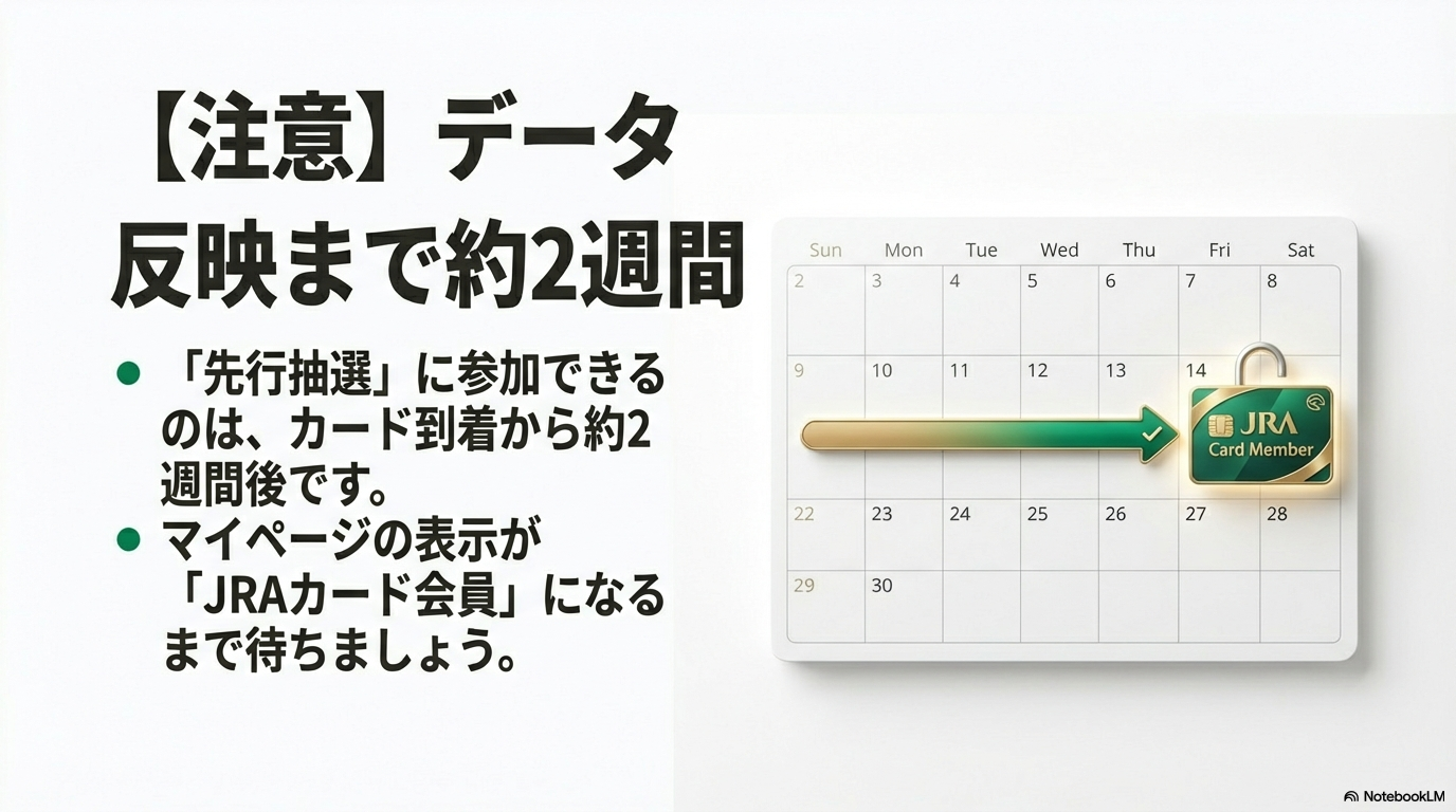 JRAカードが届いてからシステムに権利が完全に反映されるまで、約2週間程度のタイムラグがあることも忘れずに。今週末の予約に間に合わなくても、今のうちに設定を済ませておくことが、来週、再来週の「当たり」を引き寄せる最短ルートです!