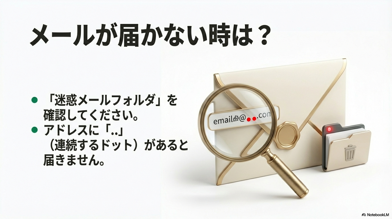 | アドレス形式 | ピリオドの連続や位置 | RFC違反ならデスクへ電話して変更 |