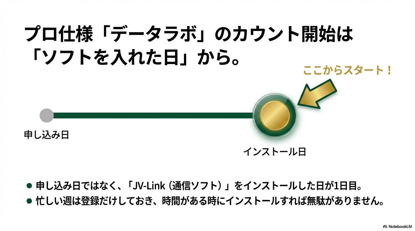 データラボの無料体験は、利用申し込みをサイト上で行った瞬間ではなく、「JV-Link」をパソコンにインストールした日を1日目として、1ヶ月間(31日間)と計算されます。