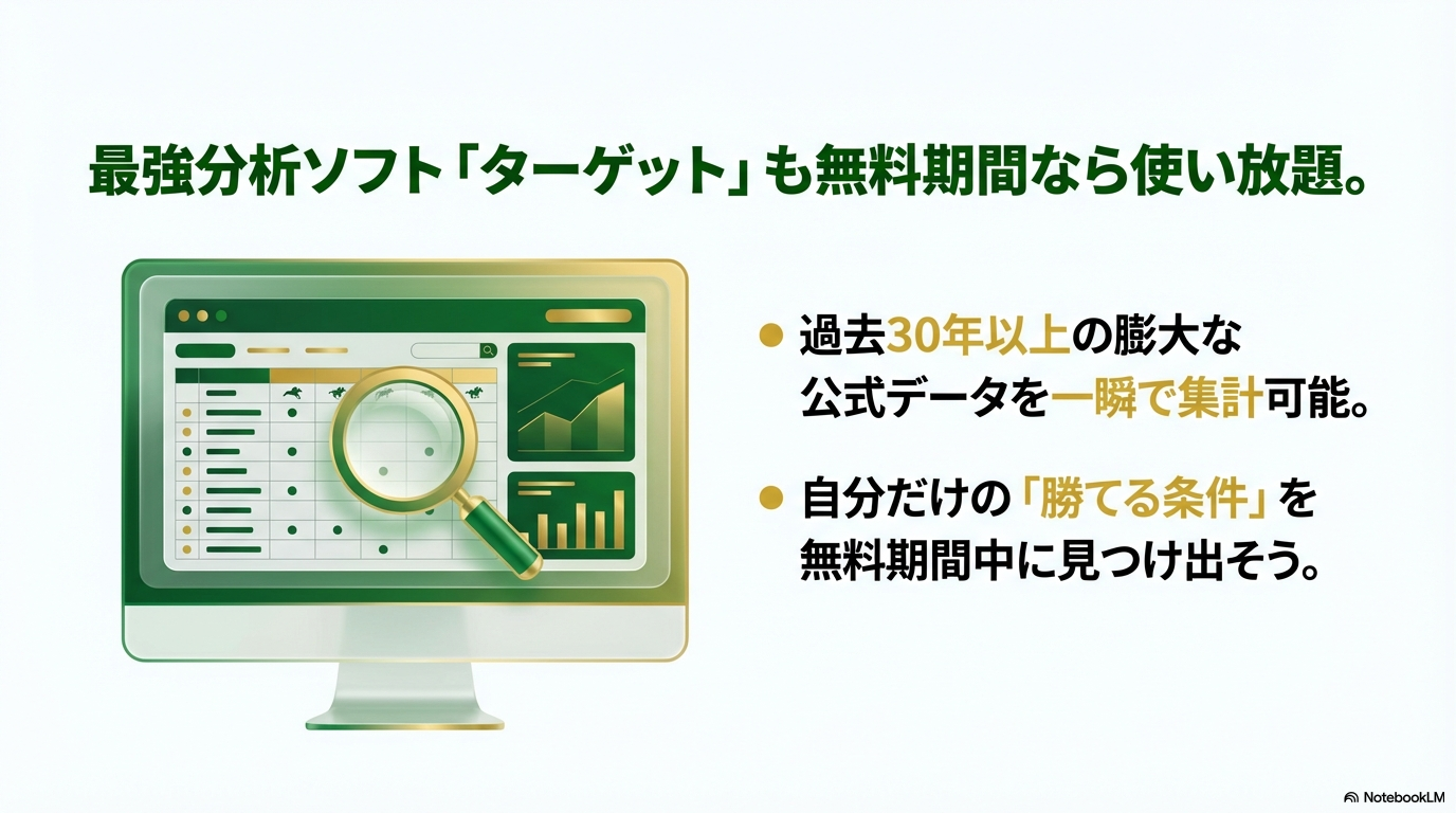 もし、あなたが「もっとガチなデータ分析を無料で試したい」と考えているなら、まずはJRA-VANのPC版にある無料期間を使い倒してみるのも一つの手です。以前、私のブログでもJRA-VANネクストとデータラボの機能・料金の違いを詳しく解説しましたが、本格的なソフトを無料で触れる期間があるのは公式ならではの特権です。また、さらにディープな投資競馬を目指すなら、JRA-VANターゲットの料金と使い方を今のうちに予習しておくと、無料期間が始まった時に迷わずスタートダッシュを切れるはずですよ。