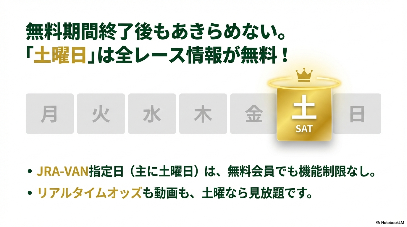 • 戦略2:無料お試し終了後は、土曜日限定の「指定日無料開放」を使い、重賞の検討や馬券購入に役立てる